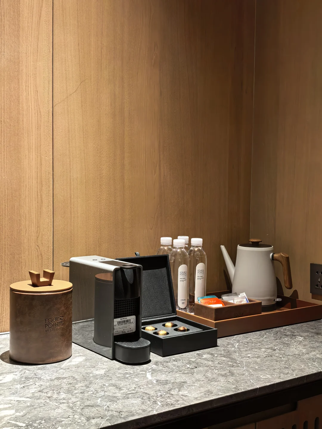 400+钛金卡给了68平套房,一卧室套房,空间中规中矩,布局清晰,床品舒适度。在福朋少见的咖啡胶囊、首饰盒、耳塞及浴缸。