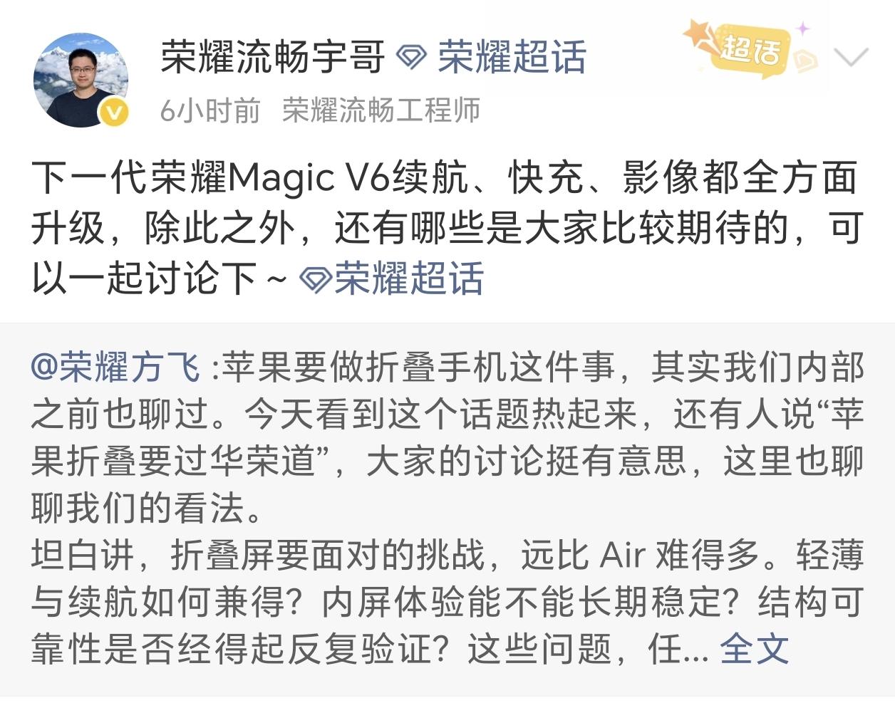 刺激啊…OPPO Find N6和荣耀Magic V6正式开始预热,春节后就要正面硬刚了! OPPO死磕折痕,号称接近无痕,折叠屏最大的折痕问题应该得到很大提升。荣耀这边更猛,听说超薄机身、超长续航,影像以及快充这些升级都只能算基本盘了,这次会有很多新技术要上了,有些以前不敢想的都给实现了。 看来开年折叠屏就会上演一场神仙打架~大家只要坐等就对了!