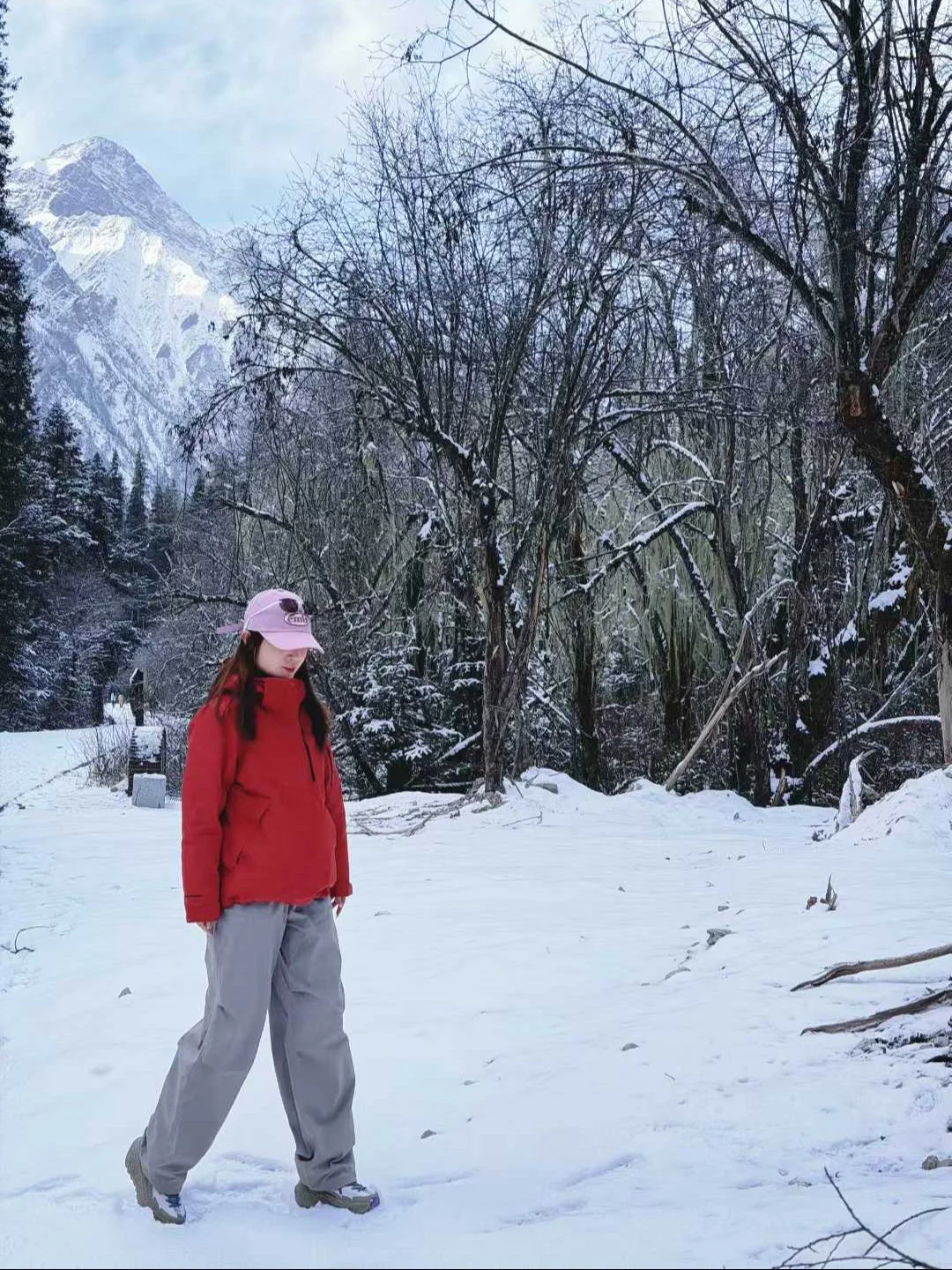 2. 配饰:红色围巾、贝雷帽,点缀画面又保暖,徒步时可戴手套,不影响拍照