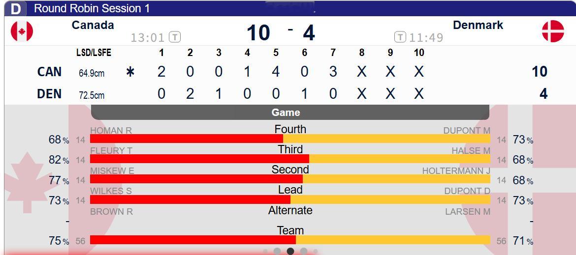 【奥运冰壶】女子循环赛第一轮 加拿大10-4丹麦,提前三局握手霍曼成功在奥运会复仇(2018年平昌循环赛负丹麦),并取得开门红