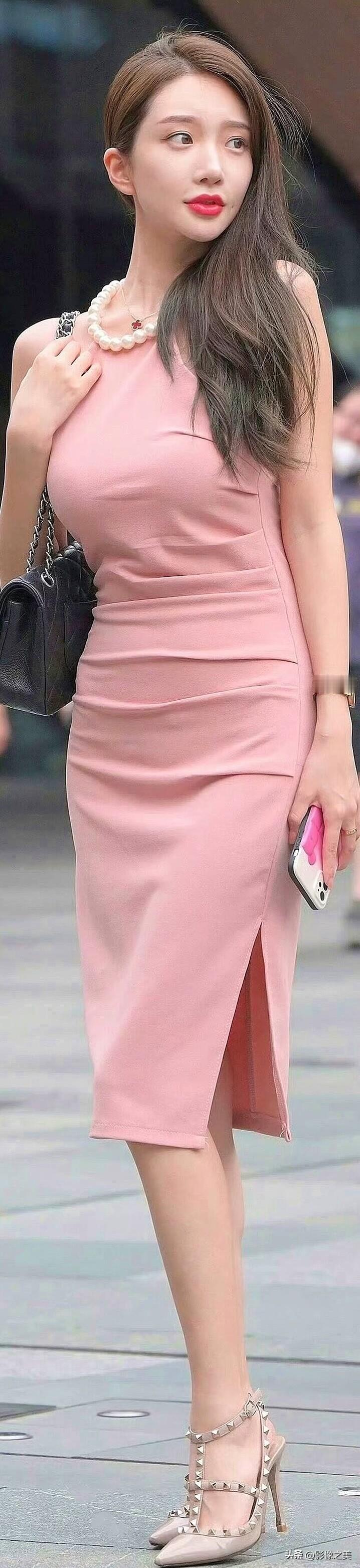 粉色挂脖长裙搭配珍珠项链,温柔又显身材,铆钉高跟鞋增添了一丝个性,是街头亮眼的存