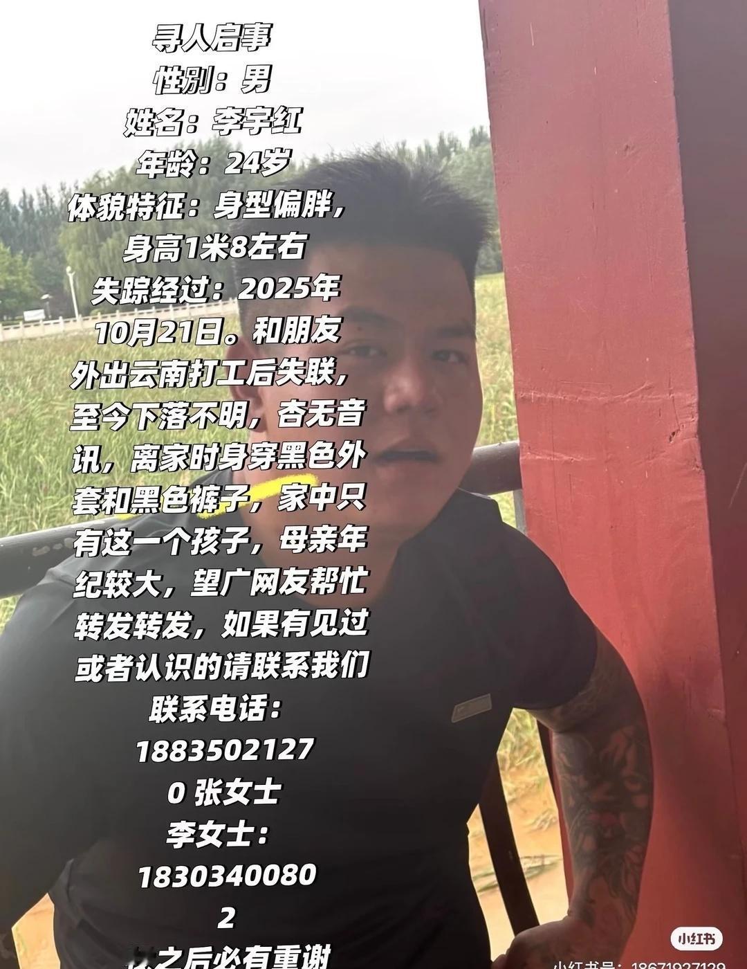 回家吧李宇红妈妈在等你回家❗️❗️❗️ 寻人启事 性別:男 姓名:李宇红 年龄:24岁 体貌特征:身型偏胖,身高1米8左右 失踪经过:2025年10月21日。和朋友外出云南打工后失联,至今下落不明,杏无音讯,离家时身穿黑色外套和黑色裤子,家中只有这一个孩子,母亲年纪较大,望广网友帮忙转发转发,如果有见过或者认识的请联系我们 联系电话: 18835071270 张女士 李女士: 18303400802 找之后必有重谢@会火 @人民网