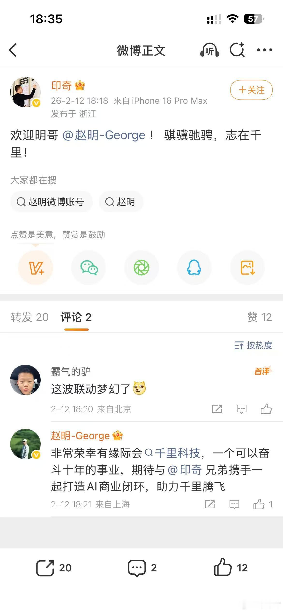 赵明回应加入千里科技 评论区有人在问:他为啥选千里?我猜两个原因。一是赛道对,AI是他公开说过“想再投十年”的方向;二是阶段对,公司技术底子已经打好了,缺的就是把技术卖出钱的人。他去不是开荒,是一起提速的。
