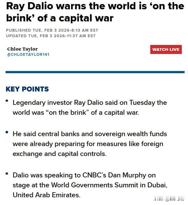 传奇投资者、桥水基金(Bridgewater Associates)创始人雷·达里奥(Ray Dalio)在 2026 年 2 月 3 日于阿联酋迪拜举行的世界政府峰会(World Governments Summit)上发表了以下预警: 世界正处于资本战争的边缘 金钱正在被武器化。 贸易禁运 阻碍进入资本市场 利用债务所有权作为杠杆 持有美国国债的外国投资者陷入了困境。 欧洲担心受到制裁。 美国担心外国买家会停止通过购买地下储罐来弥补财政赤字。 作为回应,主权财富基金和中央银行 正在为资本管制做准备。 历史上,资本战争往往围绕重大冲突爆发。 目前与中国的僵局可能是催化剂。 达利欧的建议:买入黄金 核心观点总结 资本战争的边缘: 达里奥表示,由于地缘政治紧张局势加剧和资本市场波动,世界正处于“资本战争”的边缘。这意味着资金正在被“武器化”,具体手段包括贸易禁运、限制进入资本市场或利用债务所有权作为杠杆。 机构的准备: 他指出,各国央行和主权财富基金已经在为外汇管制和资本管制等措施做准备。 风险诱因: 达里奥提到了对相互制裁的恐惧,特别是欧洲与美国之间可能存在的依赖性风险。此外,他之前也曾警告,美国激进的政策可能导致各国抛售美国资产,从而引发“资本战争”。 投资建议: 在这种不确定性下,达里奥重申黄金是抵御市场波动和货币秩序崩溃的最安全对冲资产。