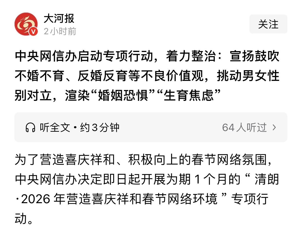 国家终于要出手整治挑动男女对立、反婚反育这种价值观的内容,但炒作“原生家庭”话题,刻意带偏孩子和父母之间关系,把“断亲”当作自我解放的这类内容,对中国传统文化的杀伤力丝毫不弱,这些内容本身没有深度但对于涉世不深的青少年很容易产生负面影响,中国人讲究的是家国情怀,这种思维引导相当于是在破坏根基。