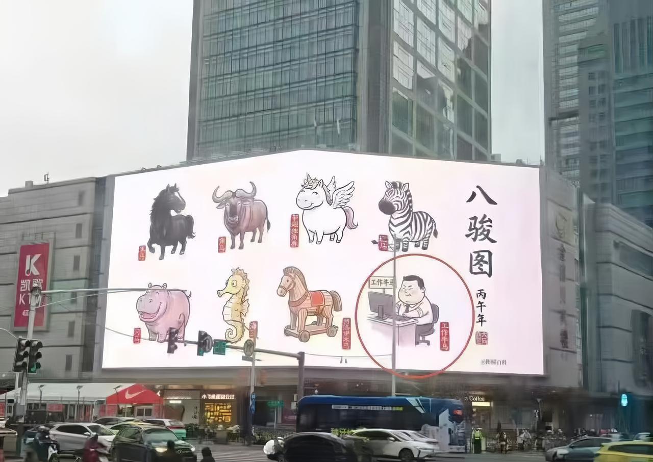 恕我眼拙,右下角那是什么马? 超市外面的大屏幕上放出了一张“八骏图”,本来马年展示八骏图没什么大惊小怪,但是定睛一看,图上有角马、有木马、有河马......最搞笑的是右下角有个加班的人,仔细一想,哦,原来是牛马。 现在的网友可真是会整活啊,笑死我了。 不过话说回来,牛马也是马,而且是勤勤恳恳的马,没有牛马们的辛苦付出,哪有现在的幸福生活?马年就要到了,祝各位马到成功,马年行大运!