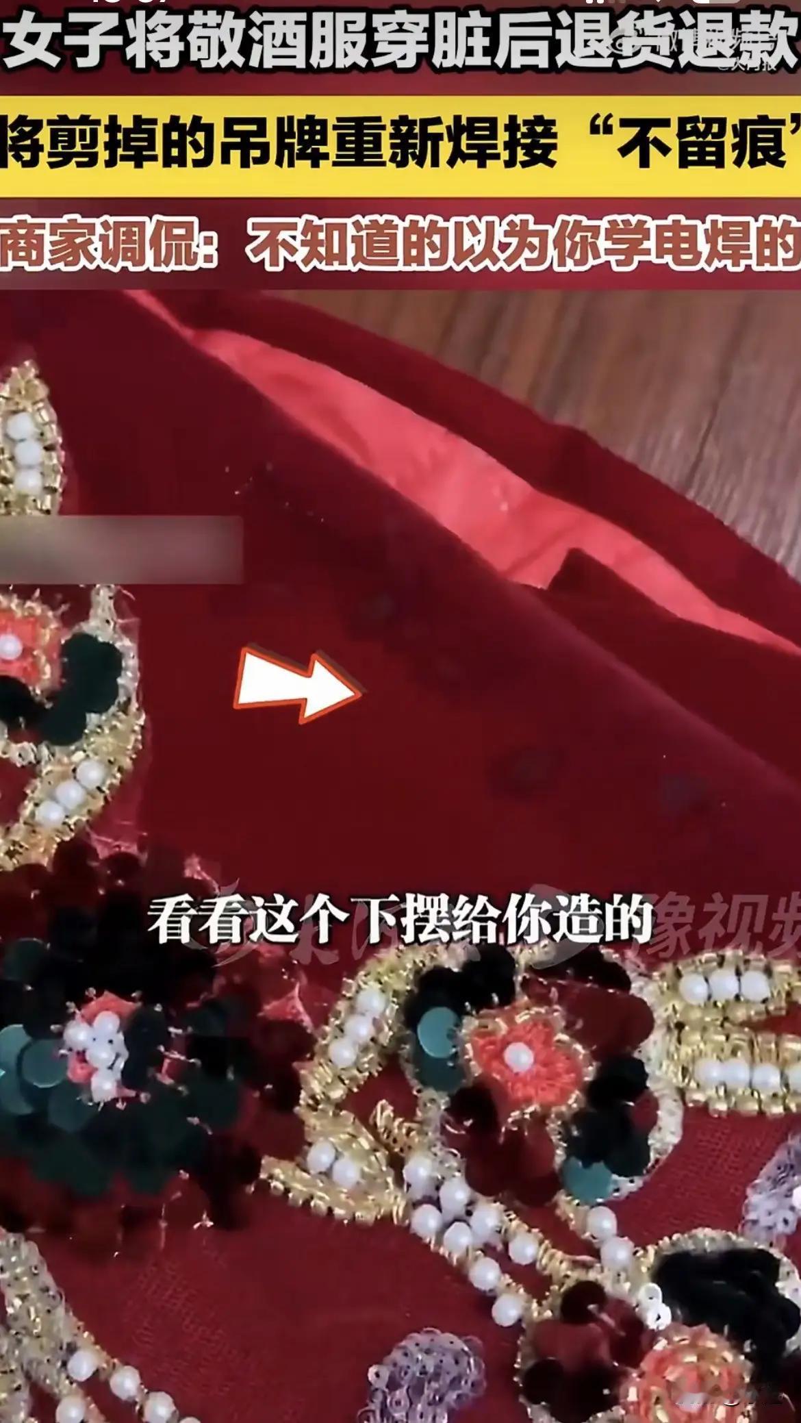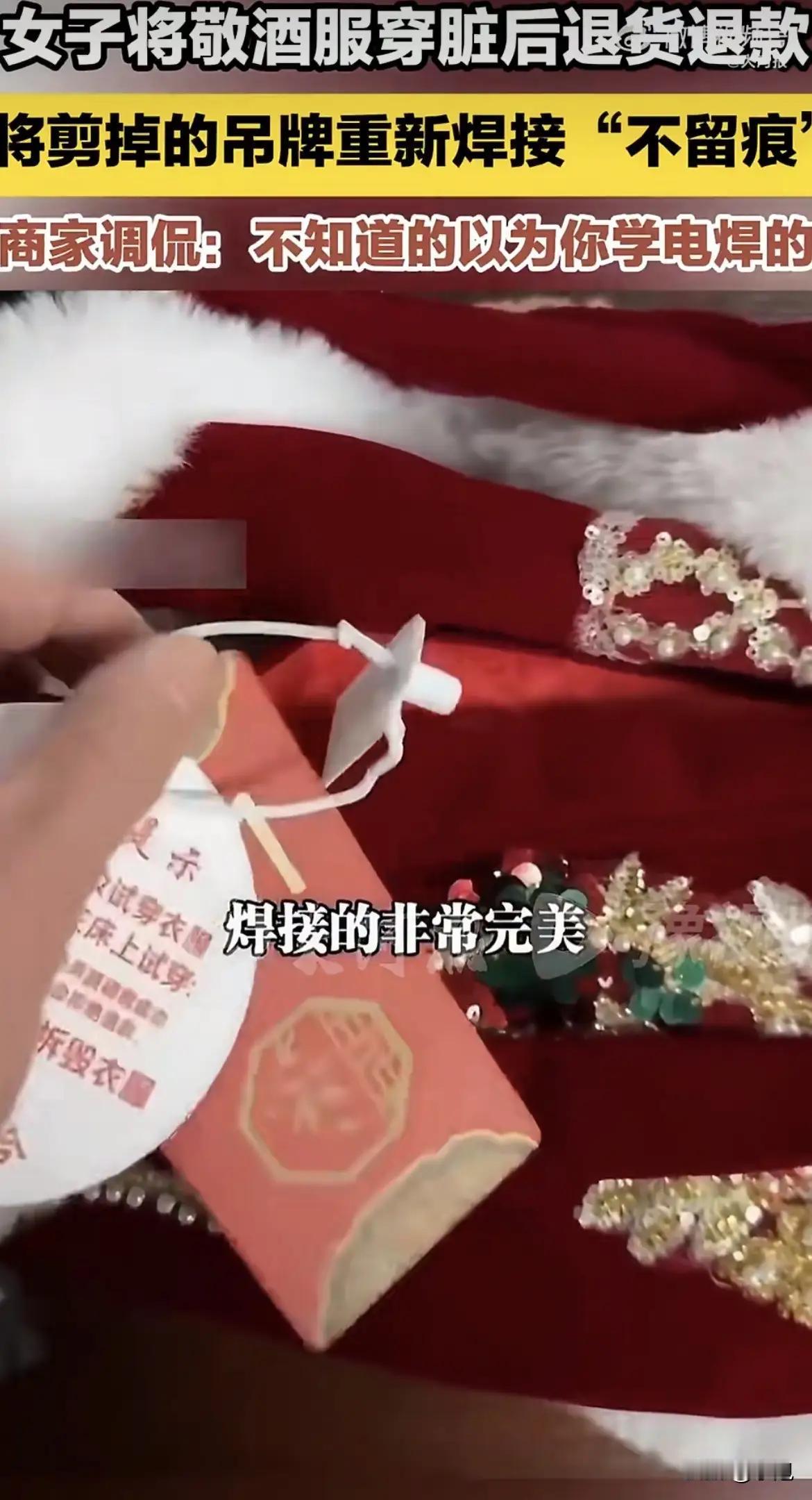 山东巨野太平镇的这位新娘子,这下要火遍全网了!她退回了穿过的敬酒服,但把拆掉的吊牌给焊上了,焊接技术堪称一流,不仔细看,都不知道拆过!吊牌焊的挺完美,下摆弄了那么多泥点子,咋还好意思退呢? 二月十日,安徽一商家,在网上委屈巴巴的晒出了一件敬酒服。那件敬酒服见证了一个新娘的高光时刻,本应留在她的衣柜中,却以一种意想不到的方式,在网络上走红了,因为她被新娘赋予了一个焊接过的吊牌,让商家不禁惊呼,新娘子是不是电焊专业毕业的?咋焊的这么完美! 真是丢人丢大发了!一生当中的好日子,留下做个纪念不好吗?干嘛做出这么丢脸面的事,真的穷到这种程度了吗?有这个聪明劲,干点啥不能挣回这件衣服的钱呀,偏偏选了一条最愚蠢的路! 这下好了,大伙都知道了,以后可怎么见人呢?[捂脸][捂脸][捂脸]