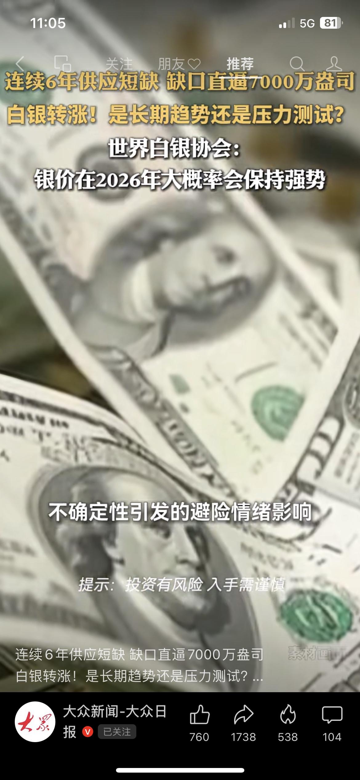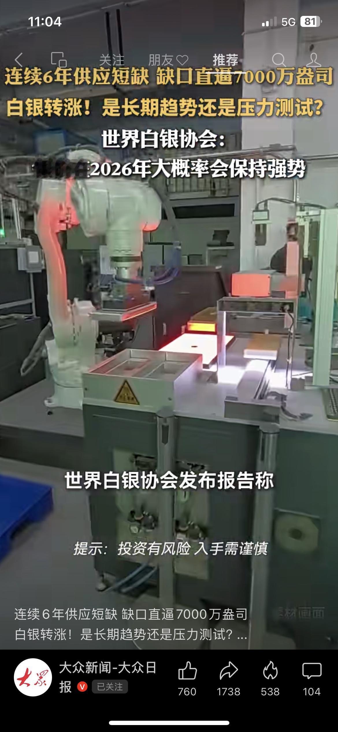 白银传来关键信号!连续6年供应短缺,缺口约6700万盎司,世界白银协会表示2026年银价有望保持强势。白银不只是避险资产,更是光伏、电子、新能源的核心工业原料。普通人不必重仓,但可作为资产配置的一部分。 市场有风险,投资需谨慎。 你会配置白银作为家庭资产吗? 白银供应短缺 银价趋势 工业金属