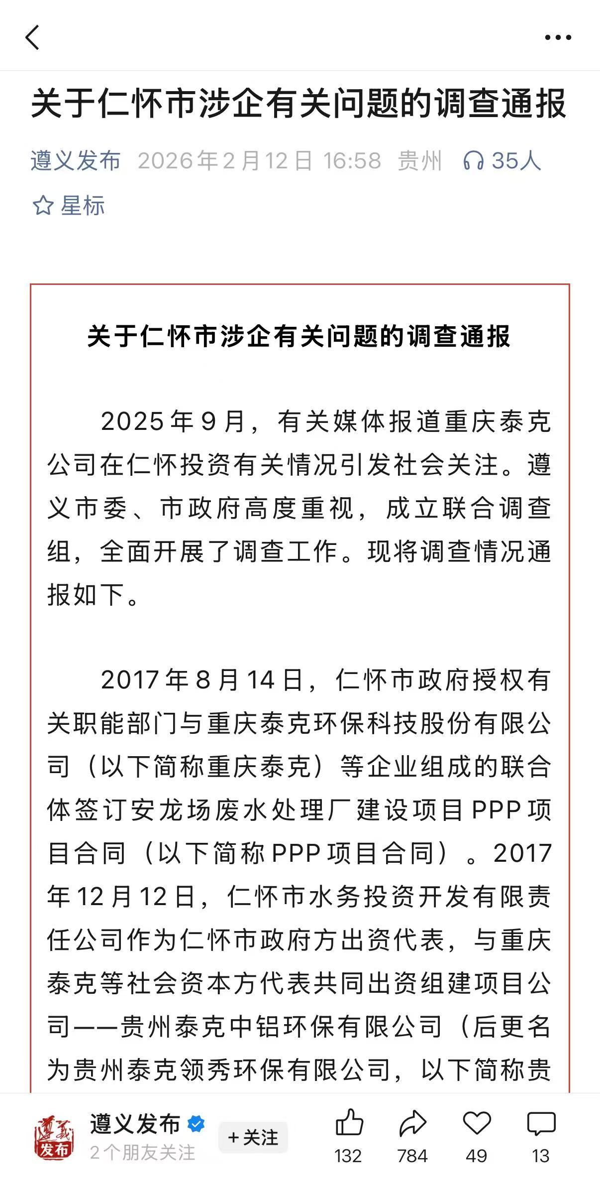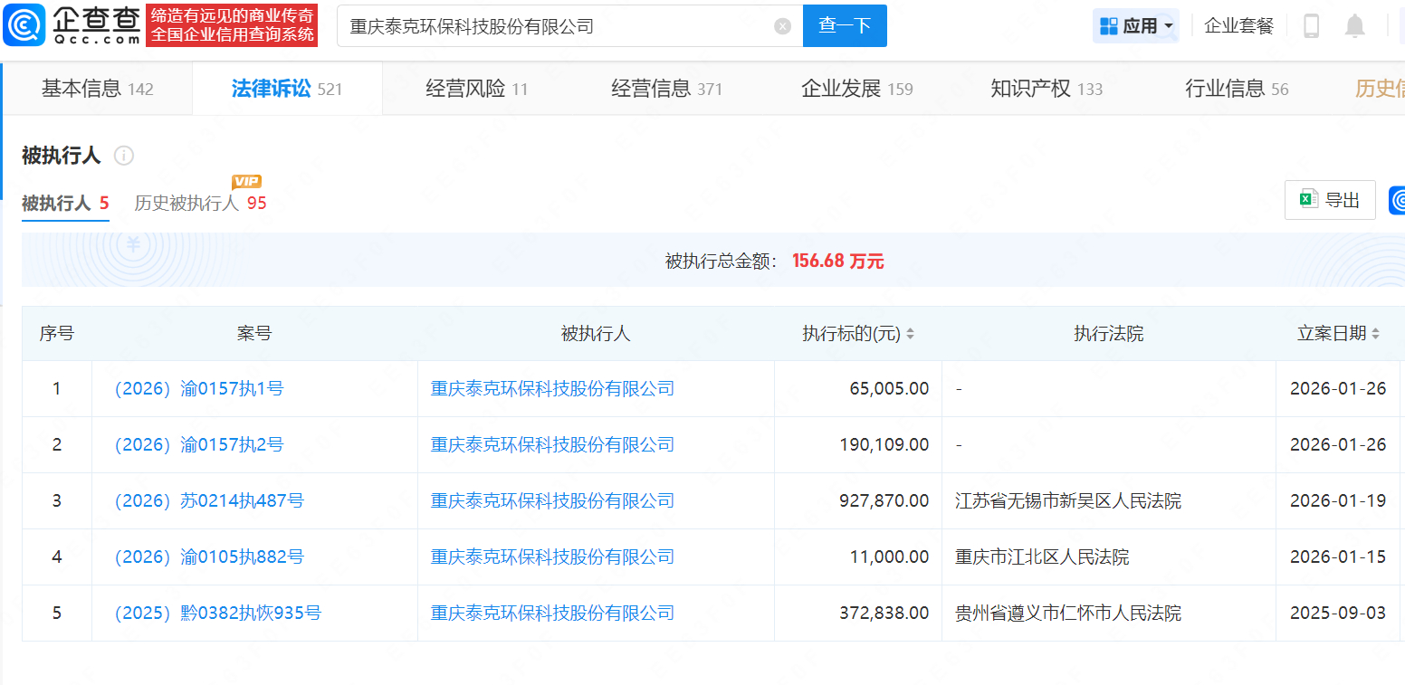 2025年9月,重庆泰克环保科技股份有限公司创办人唐显策反映,其在茅台镇投资8个亿建好的白酒生产废水处理厂,却被仁怀市工业和商务局人员拿着一张解除合同通知书,把人都撵走,强行接管处理厂。2月12日,贵州遵义市联合调查组发布相关调查通报称,仁怀临时接管企业的行为不合规,废水处理厂已全面移交泰克。企查查APP显示,重庆泰克环保科技股份有限公司成立于1997年12月,法定代表人为陈茂明,注册资本约1.87亿元,该公司现存多条被执行人信息,累被执行总金额超156万,此外还存在多条股权冻结、失信被执行人(老赖)及限制消费令信息。