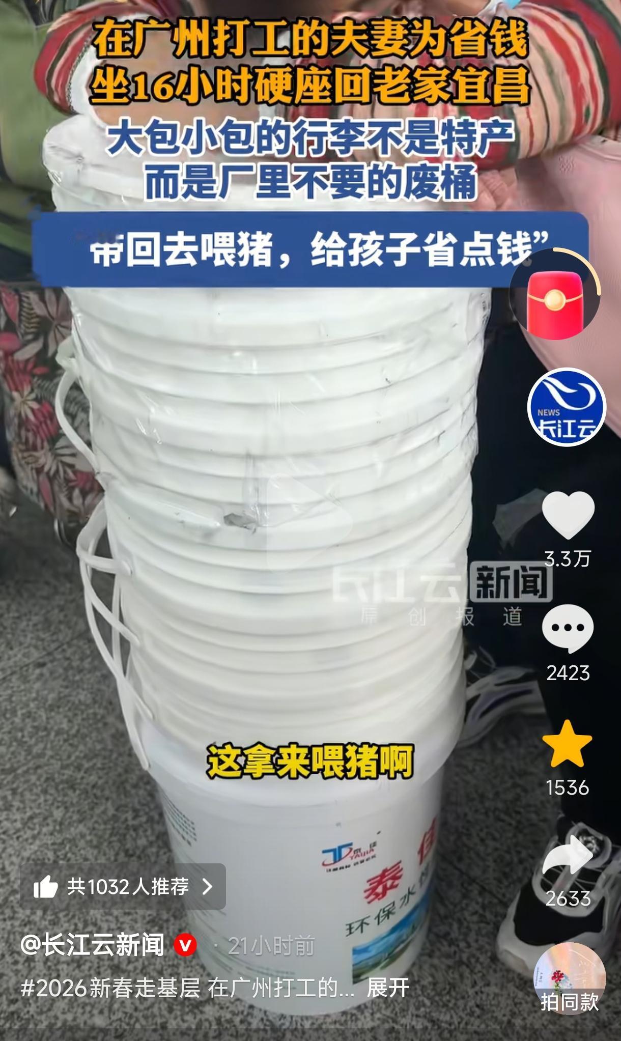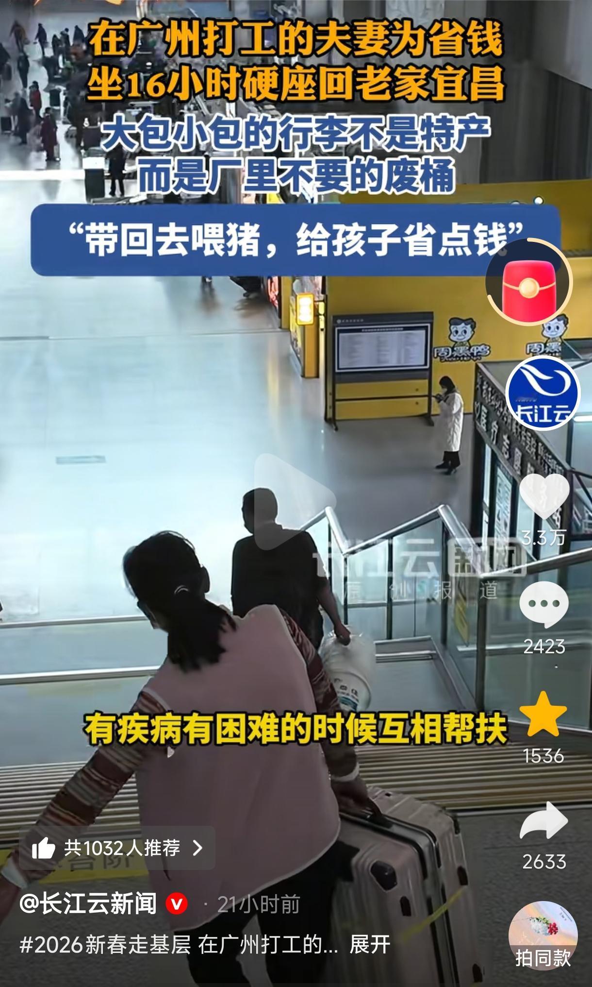 “心酸又感动!” 一对在广州打工的夫妻为省钱,花了200元买16小时硬座绿皮火车票回宜昌过年,身边的行李十分引人注目,不是大包小包的特产,而是数十个废桶,男子说是为减轻孩子负担带回家喂猪用的,而被问及妻子,男子一句话难掩宠溺与担当,看得人泪眼婆娑。网友:年轻时觉得带这些东西回家很丢人,现在觉得这就是我们最平凡人的生活啊。 (来源:长江云新闻) 2月11日,南方小年这一天,在武昌火车站,有一对夫妻尤为引人注目,他们行李里带着的不是大包小包的特产,而是数十个摆放整齐的白色塑料桶,这在返乡过年的旅客中十分显眼。 这一对夫妻是从广州回湖北宜昌老家过年的,为了省钱,男子特意买了200多元的绿皮火车票坐16个小时的硬座回家,称买高铁票要花去六七百元,但坐绿皮火车就能省下近五百元。 而被问及千里迢迢带几十个桶回家有何用途时,男子坦言:“这些桶是厂里不要的废桶,拿回家喂猪用的,一般人不会这么大老远带废桶回家,但我们捡回家有用处的,这样也给孩子省点钱。” 可见,男子是一位十分节俭的人,厂里不要的废桶别人觉得带回家会不好意思,但他全然不在乎别人的眼光,只因为自己觉得有用处。 这时,妻子看起来十分疲惫,趴在桶上休息,原来妻子一直生着病没有上班,现在病情还没完全好转。男子为照顾妻子选择当保安这样可以看着妻子,后来妻子病情好转,男子这才去厂里上班。 这真是一位十分有担当的男人啊,令人肃然起敬,之后男子一席话更是令很多人 泪眼婆娑:“人生相伴,有疾病、有困难的时候互相帮扶,并不是一种拖累。” 网友们看到这一幕,也是纷纷泪目了。有网友说,年轻时觉得带这些桶回家很丢人,现在才明白这才是平凡人的生活。 也有网友说,男子最后那句话是我26年里听到最温暖的话我看了不下十遍,他说出了一个丈夫该有的责任与担当,比任何山盟海誓都真挚。 还有网友说,这是父辈母辈的真实缩影,一生省吃俭用都为了孩子,又对病患妻子不离不弃,真是一位好爸爸,好丈夫。也让我们看到了父母辈那代人是有爱情的。 这一对夫妻的案例,看得人泪目不已。 父母宁可省吃俭用吃苦受累,也不舍得对自己好一点,这是在给孩子、给家庭留后路。别人回家过年衣锦还乡带着大包小包年货,他们却带了一堆不要钱的废桶,只减为轻孩子负担。 而就算日子再难,男子也没嫌弃病妻,一句“她不是拖累”令很多人破防。常言,少年夫妻老来伴,男子一直带妻子在身边照顾,把她当成一辈子守护的人,自己则默默扛起家庭重担。 这是一个最真实的中国式男人,没有豪言壮语,只有淳朴善良,却用行动诠释出了对家庭对爱人全部的爱,比任何山盟海誓都更真挚,写尽一位父亲、一位丈夫的责任、心疼与守护。 其实,贫穷不足以定义人生,而是在苦难日子里依旧拼尽全力守护家人的那颗心,这一份认真与努力才真正令人破防。 祈愿这对夫妻一生平安顺遂,幸福快乐。同时祝愿所有认真生活、拼命护家的人,都能被生活、被这个世界温柔以待。