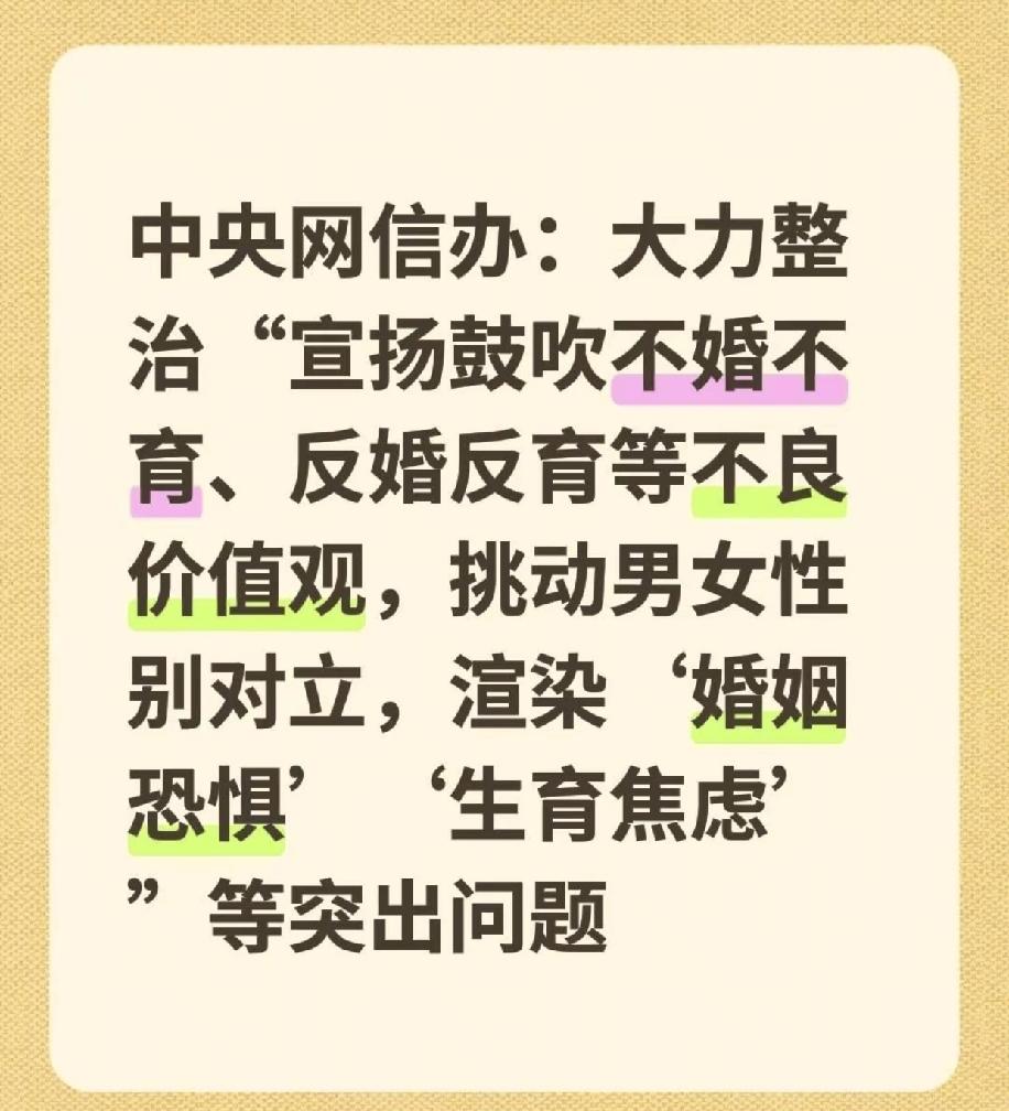 大力整治,宣扬不婚不育,反婚反育,男女对立,婚姻恐惧,生育焦虑等的核心在哪里呢。 丁克问题,这一说法算什么,算犯罪还是什么,如果有这个思想并宣扬这种思想的人,先给他做体检,如果体检身体原因,然后宣传这种思想,就算包藏祸心,反人类罪。 还有那些个女拳组织,这一下他们一拳打过来,是不是要有个男拳组织。 高彩礼问题等等。 最后结婚有奖励没,生小孩有奖励没,既然人口是根本,春秋时期的越国不就有10年生育,10年教育,不就是一代人吗?