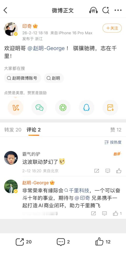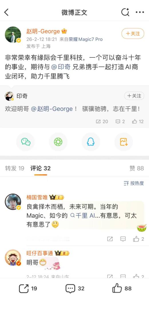 赵明回应加入千里科技 官宣了,实锤了,看来明哥没去智界,也没去字节,选择了和印奇一起“再出发”。手机圈高管往汽车圈流动仿佛已经成为了主流,因为智能汽车正成为最大的移动智能终端,手机行业的技术、体验与商业化能力,正在成为车企的核心竞争力。