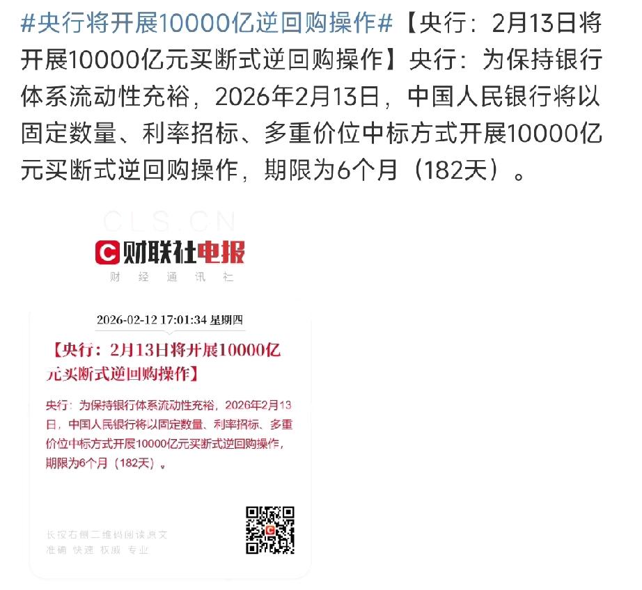大放水开始了…… 前不久是2000亿逆回购,紧接着现在又要进行一次10000亿逆回购,如此快频率、如此巨额的货币投放操作几乎可以说明: 2026年或成为史上大放水首年,因为需要钱的地方太多了: 回笼房地产需要钱,特大型基建需要钱,刺激消费需要钱,备战更需要钱…… 事实上,这种操作已经根本停不下来了,更不敢去踩刹车!