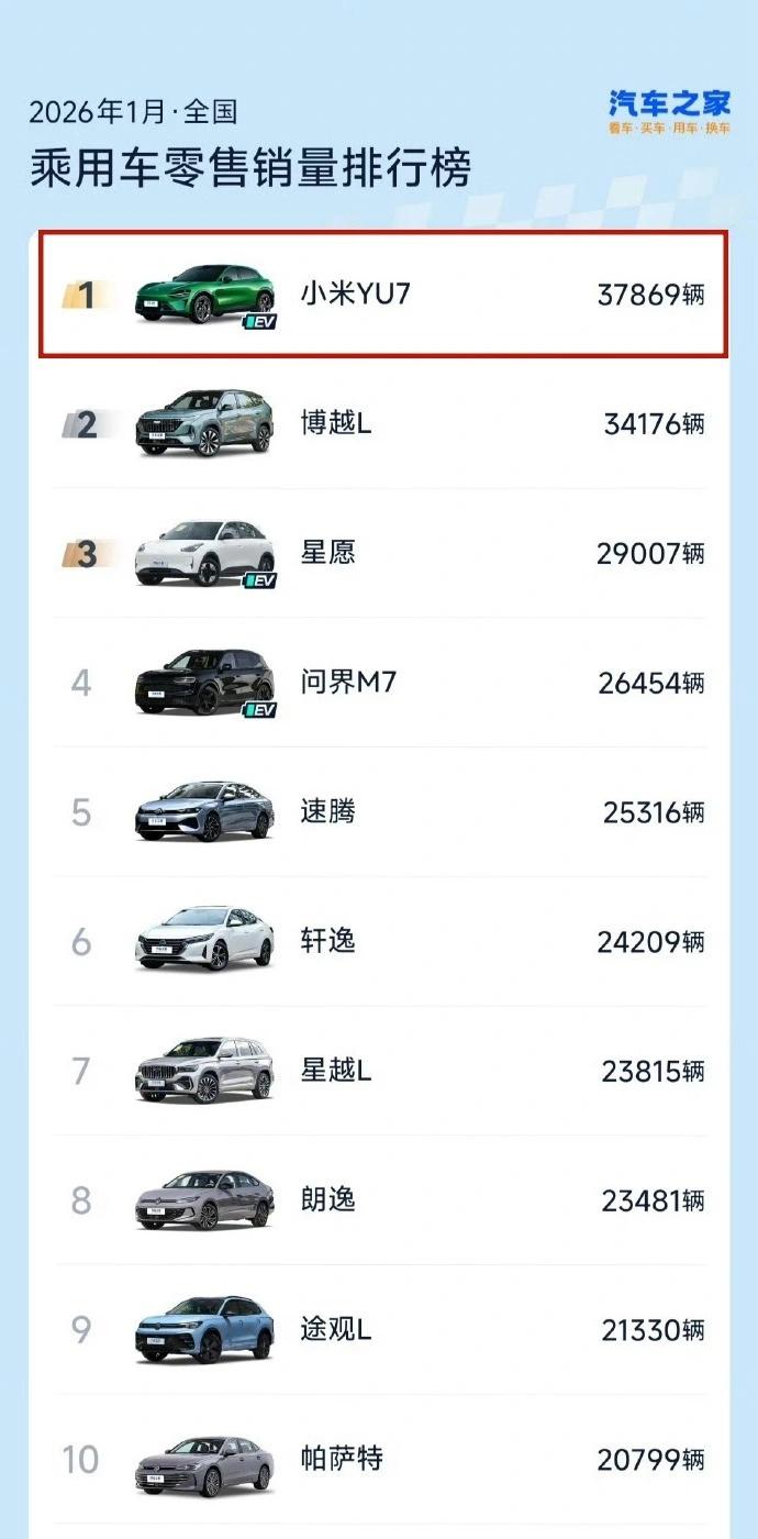 还真是,小米争议越大,销量越大,小米YU7 1月登顶乘用车销冠!淡季稳坐第一,简直太能打了! 2月12日雷军官宣,小米YU7 1月零售销量37869台,环比微降仍跃升两位,拿下全国乘用车零售榜首!力压吉利两款车型,特斯拉Model Y仅16845台排第20。 小米春节门店不打烊,7*24小时在线服务,再有YU7少量现车可当天提。现在,初代SU7已停产,累计交付超38万辆,新一代SU7 4月上市、22.99万起预售,预计下个月还会销量不错。 到现在,小米汽车累计交付近60万,2026目标55万。小米能淡季逆势领跑,估计小米新能源实力有可能再次出圈!