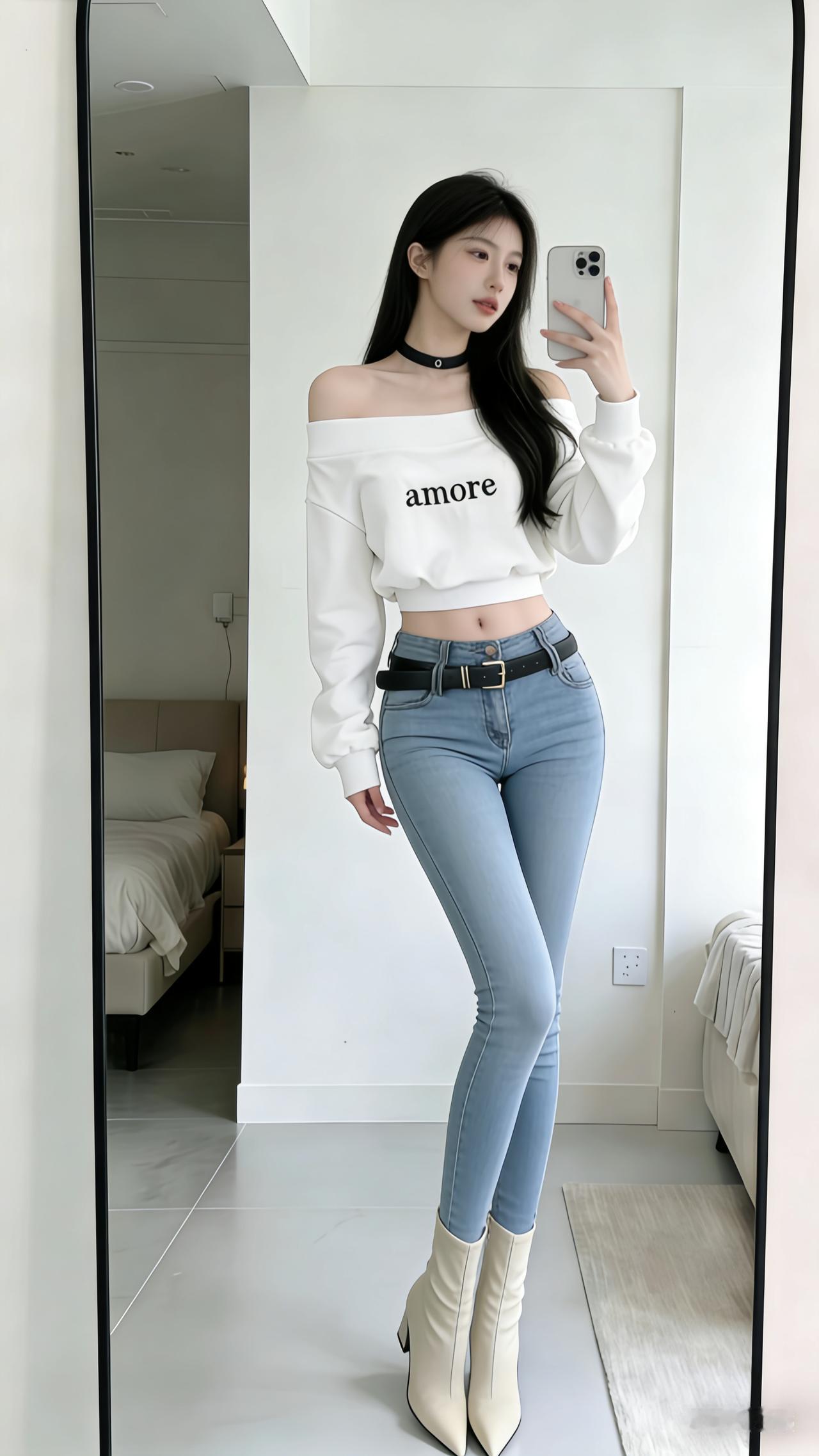 白色毛绒外套+牛仔裤+长靴,轻松驾驭都市时尚!👗👠💃