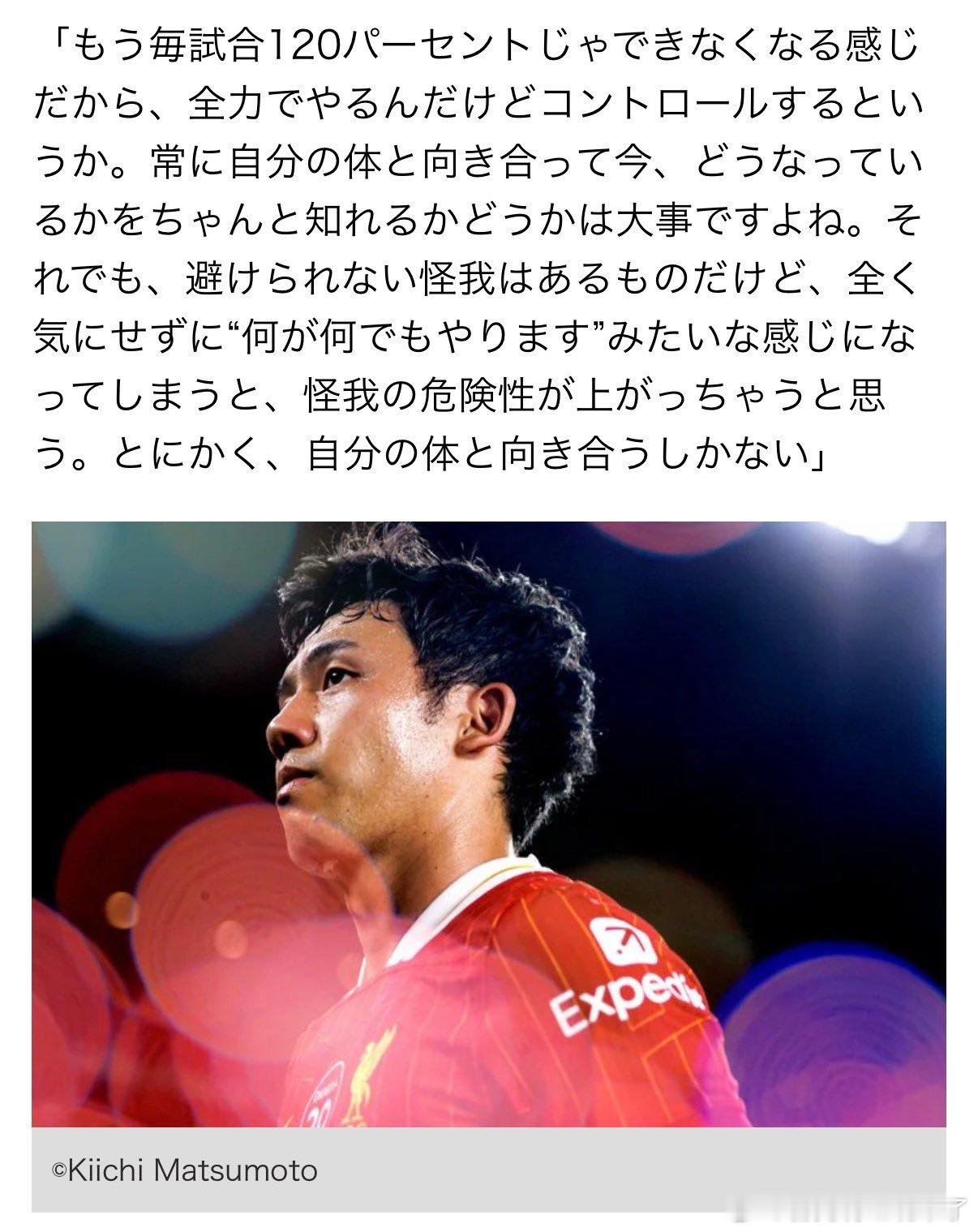 “我感觉已经无法每场比赛都拿出 120% 的状态了,所以虽然会全力以赴,但也要学会控制。重要的是要时刻关注自己的身体,清楚地知道当下的状况。当然,有些伤病是无法避免的,但如果完全不在意,抱着‘无论如何都要上’的心态,受伤的风险就会升高。总之,只能和自己的身体好好相处。”