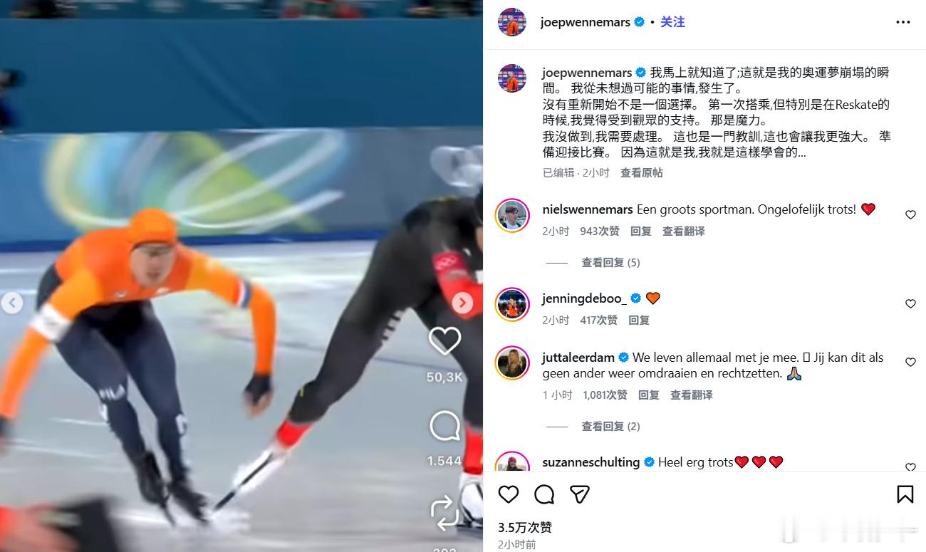 他在ins上发文说:“ 这就是我的奥运梦崩塌的瞬间。” 还把冰刀相碰瞬间的视频放出来了...