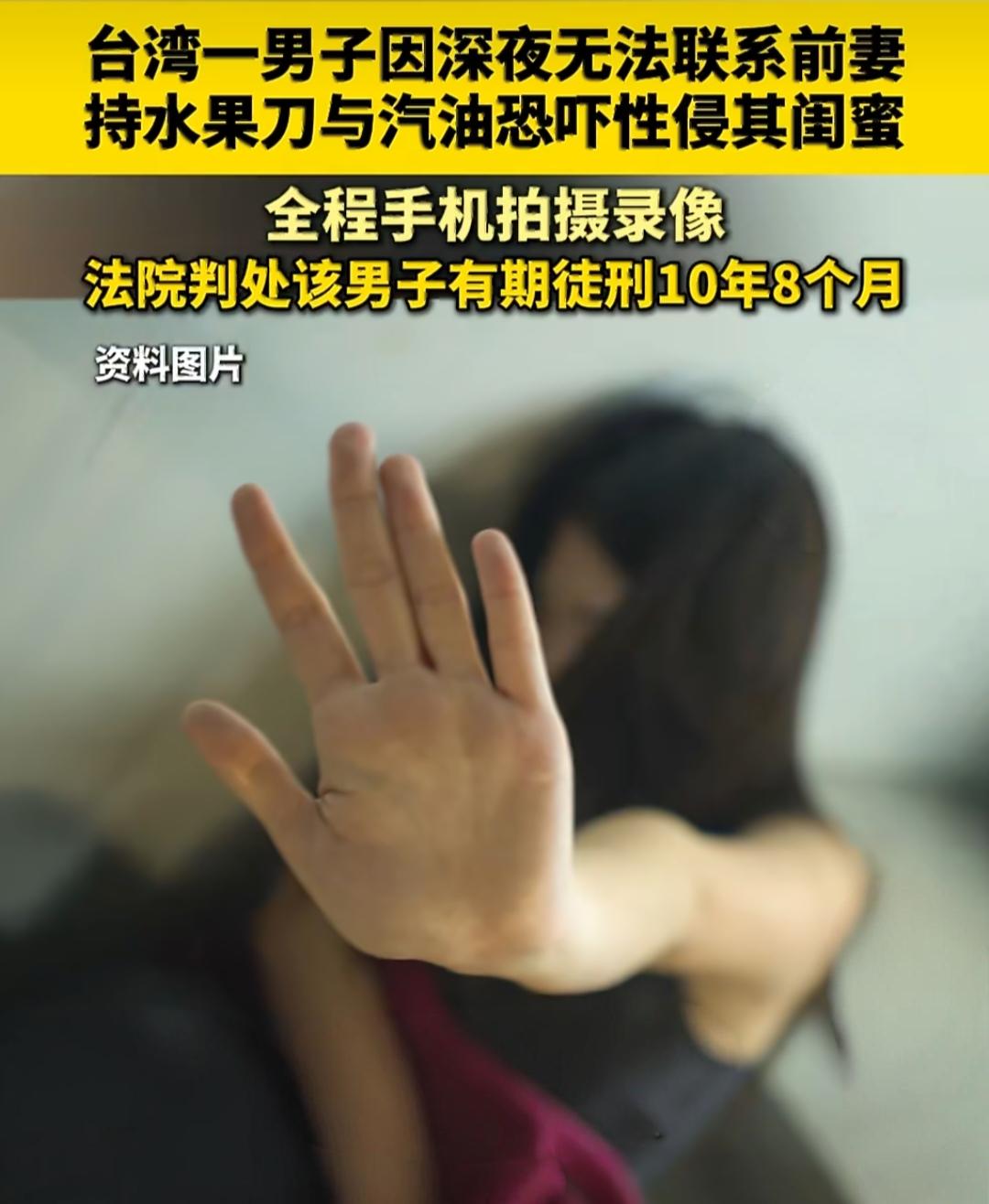 找不到前妻就性侵她闺蜜?男子被判10年8个月,还得赔200万! 台北一男子深夜联系不上前妻,竟然带着水果刀和汽油,跑到前妻闺蜜家楼道里埋伏。等受害者开门回家时,他强行尾随进屋,还收走她手机不让求救。 受害者男友发现她失联,赶紧报警。警察上门时,男子拿着刀和汽油威胁:“敢出声就泼汽油,要死一起死!”女子吓得不敢回应,警察误以为没人在家就走了。 之后,男子持刀逼她洗澡,用刀柄敲墙、掐脖子施暴,还全程用手机录像。女子在极度恐惧下被迫配合。 法院最终判了他有期徒刑10年8个月,作案手机也被没收。受害者还提起了附带民事诉讼,要求200万新台币的精神抚慰金。 根据医疗诊断和心理咨询记录,女子案发后出现了严重的焦虑和急性压力反应,需要持续心理治疗。法官认可了这些伤害,判决男子赔偿200万,他在庭上也同意了这个金额。 网友们都炸了:“这就是禽兽!判得好!”“200万都弥补不了心理阴影,必须重判!” 这种把自己的情绪失控转嫁到无辜人身上的恶行,法律绝不会轻饶。性侵案 性侵 女生遭性侵