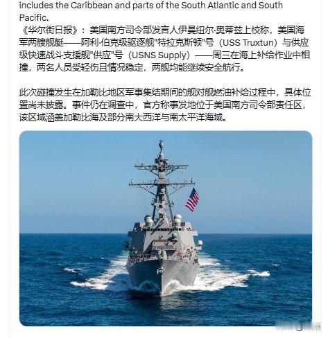 全球最强海军上演大型社死现场。 在南美附近海域,美军一艘驱逐舰和一艘补给舰,正在进行最基础的船对船海上加油。这本是海军入门级操作,结果两艘自家舰艇愣是没配合好,直接撞在了一起。 2人轻伤,舰艇还能开,没出大事,但脸是彻底丢光了。 不是遇袭、不是天灾,纯纯操作拉胯、值班走神,属于典型的熟练工种翻车。全球都在看美军秀肌肉,结果先秀了一波“精准撞自家”,尴尬到抠出三室一厅。 这一撞,撞出的不是意外,是美军日常训练松散、管理拉胯的真实写照。 只能说:丢人,你是真敢丢;撞船,你是真敢撞。
