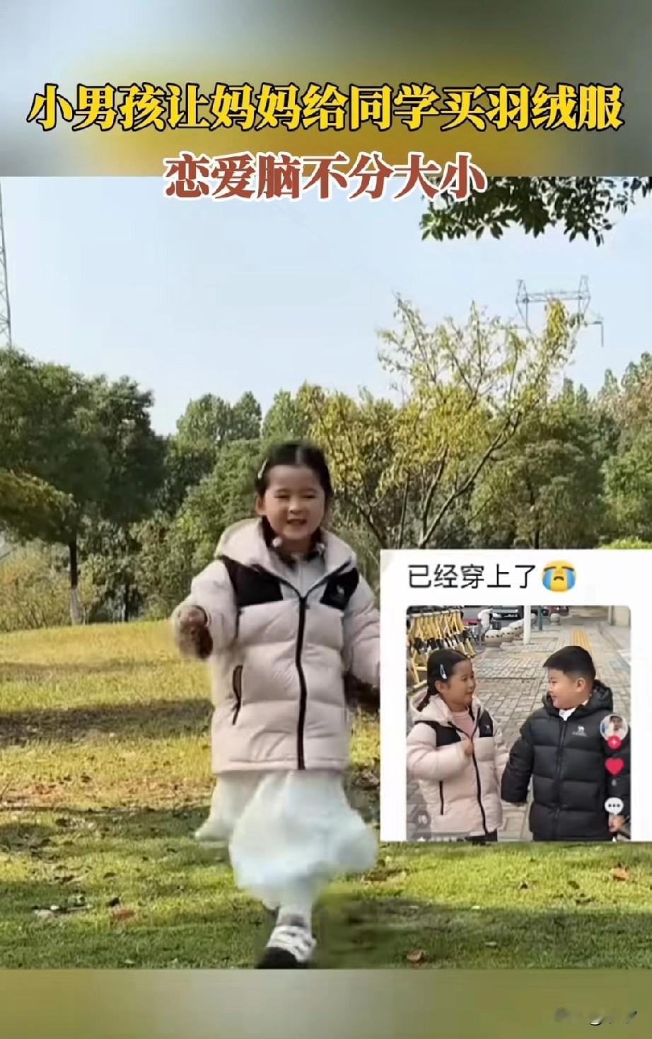 恋爱脑从小就有,这个小孩他的妈妈给他买了一件黑色的羽绒服,她穿上之后开心坏了! 最后他就问妈妈了,有没有给他的女朋友买,这让他的妈妈都懵了,问他要给谁买? 他说他要给他的女友买,他马上要和女友结婚了,必须也给女友买一件,要不然他的女友可过不了冬天! 这把孩子的妈妈都笑了,这么小的孩子就有了娶媳妇儿的意识,实在太好玩了, 网友表示这是从小有恋爱脑,还有网友表示,这是个会宠媳妇儿的主!最后他的妈妈没有办法! 也给小女孩买了一件,小女孩收到阿姨的礼物之后,拉着他儿子的手,开心的一起玩耍,这以后关系更铁了… 大家觉得这个小朋友是不是很可爱? 恋爱脑误区 恋爱脑症状 恋爱脑真相 恋爱脑回路