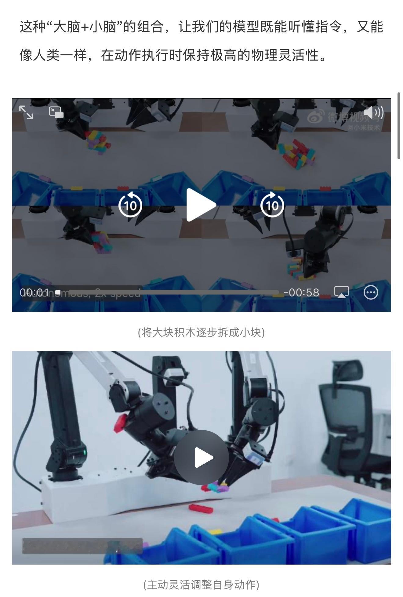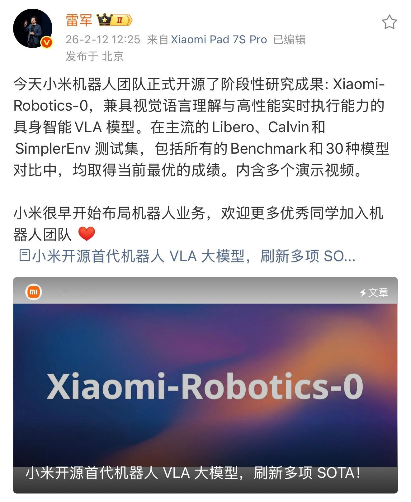 就在今天,雷总官宣Xiaomi-Robotics-0正式开源,三大Benchmark成绩全刷了一遍,直接压过OpenVLA和Pi,也就是说小米成为了目前机器人基座模型的天花板。一边大模型刚拿了SOTA,一边机器人基座模型落地,还在消费级显卡上跑通了实时推理,各条技术线齐头并进,明显是准备会师的架势。再看上周开源的那个触觉模型TacRefineNet,不用视觉、毫米级微调,两周时间,触觉和VLA两块硬骨头全搞定了,技术栈自己填平。小米发布机器人基座模型雷总之前就说过机器人第一步是进厂干活,走特斯拉那条路,现在看是真在备货,手脑配齐、开源喂给行业,离走出实验室那天不远了,机器人行业是长跑,像小米这样拿论文说话、成果全透明,才是最值得认可的!雷军公布小米机器人最新进展