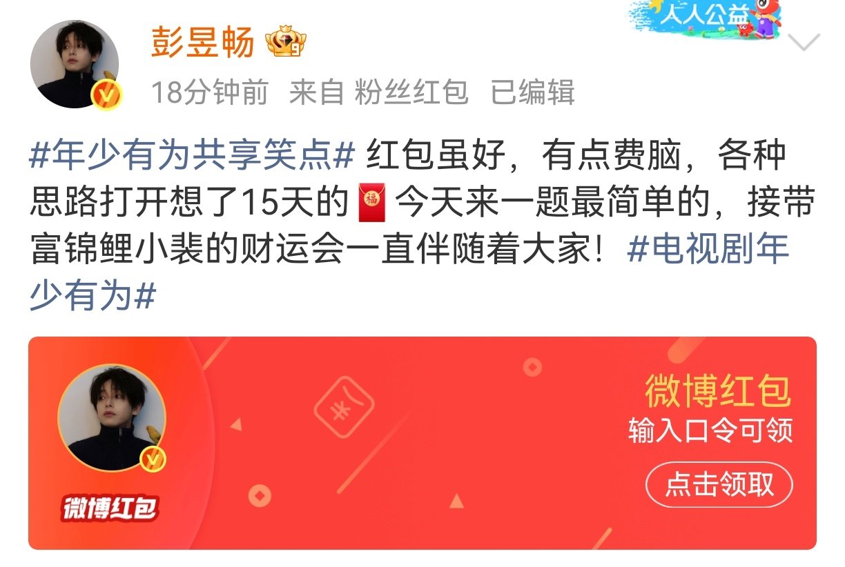 彭昱畅剧宣连发13天万元红包 新春茶话会 追《年少有为》的快乐,一半是剧情给的,一半是彭昱畅的红包给的!
