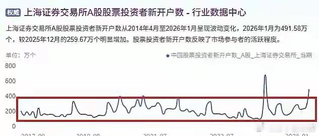 说一个有趣的股民开证券账户数据统计:2020-2021年牛市期间,单月开户数也没超过400万户。24年10月份特殊情况,飙升到600多万户。2026年1月份,开户数直接涨到490万户,相对于12月份的260万,几乎翻倍! 行情可谓火爆,如果汪汪队不抛售降温,2月份开户数肯定超500万!总的来说,开户数已经超出了2017年以来8年的箱体,开启一段新的行情。