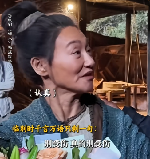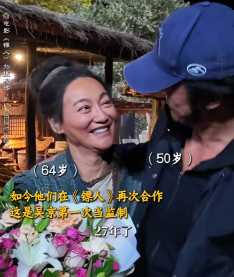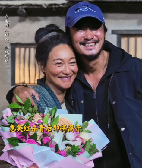 惠英红拍摄电影《镖人》杀青时,吴京特意拿上早就准备好的鲜花,献给了“红姐”,两个