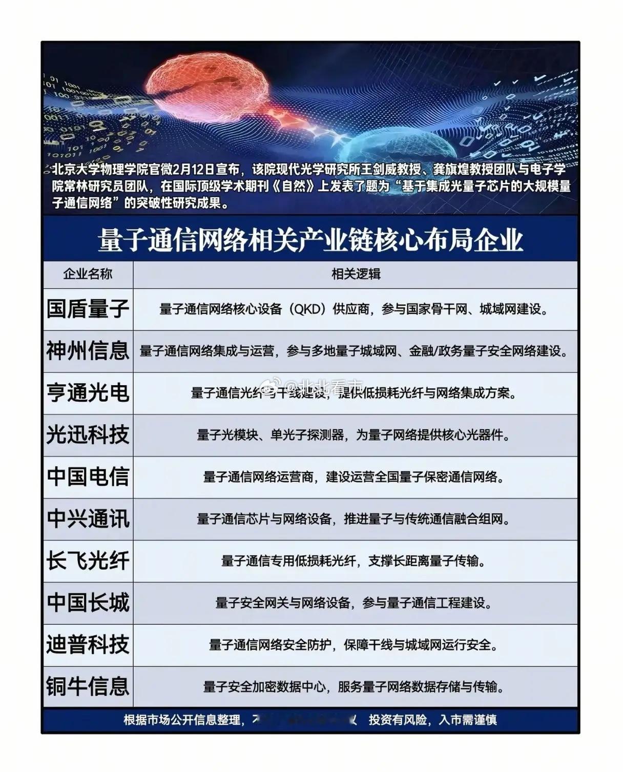 量子通信:当“绝对安全”照进现实,千亿赛道真的能一飞冲天吗?当北大团队在《自然》上发表“基于集成光量子芯片的大规模量子通信网络”突破时,我们终于看到,科幻电影里“不可破解”的通信时代,不再是遥远的想象。这不仅是一篇论文,更是一个行业从实验室走向规模化商用的里程碑式宣言。量子通信的魅力,在于它从物理原理上重构了“安全”的定义。传统加密依赖数学难题,而量子通信利用光子的量子态不可克隆、不可测量的特性,让任何窃听行为都会留下痕迹,从而实现“绝对安全”的信息传输。在AI深度渗透、数据泄露风险无处不在的今天,这种“天生免疫”的技术,无疑是数字世界的终极防线。国内产业链早已悄然布局,形成了从核心设备到运营服务的完整生态:国盾量子作为核心设备(QKD)供应商,深度参与国家骨干网与城域网建设;神州信息深耕量子网络集成与运营,在金融、政务等领域落地了多个标杆项目;亨通光电、长飞光纤提供低损耗光纤,支撑长距离量子传输;光迅科技的量子光模块与单光子探测器,是网络的“眼睛”;中国电信则作为运营商,正在建设运营覆盖全国的量子保密通信网络。从芯片、光纤到整机,国产厂商在技术指标上已追平甚至超越国际同行,成本优势更是为规模化推广铺平了道路。但在市场的狂热中,我们必须保持清醒。部分量子通信概念股在过去一年涨幅已超150%,估值已严重透支未来增长。行业仍面临三大挑战:一是量子中继技术尚未成熟,长距离传输仍依赖可信中继,限制了网络的“绝对安全”属性;二是成本居高不下,单套QKD设备价格仍在百万元级别,难以在消费级市场普及;三是部分公司只是蹭概念,缺乏核心技术与真实订单支撑,随着市场回归理性,估值分化将不可避免。2026年,注定是量子通信从“概念”走向“刚需”的关键一年。在国家“东数西算”、数据安全法等政策驱动下,政务、金融、能源等高敏感领域的需求将集中爆发,市场规模预计突破300亿元,年复合增长率超50%。但对于投资者而言,在拥抱行业红利的同时,更要警惕估值过高的风险,聚焦有核心技术、真实订单和持续研发能力的龙头企业,才能在这场通信革命中真正分享时代的红利。
