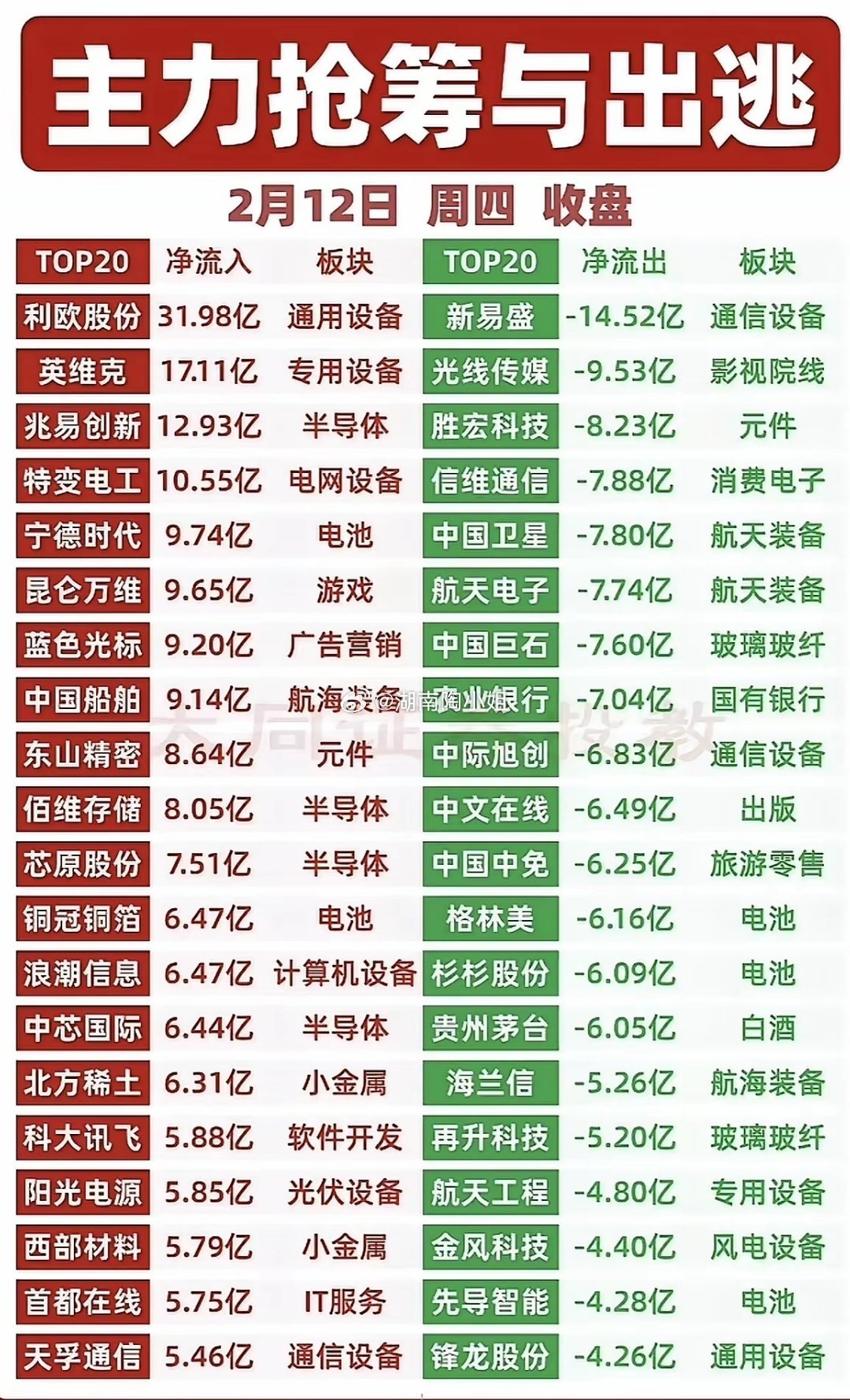基金股票 2月12日周四收盘,主力资金动向分化明显。通用设备、专用设备、半导体等板块获主力大幅抢筹,利欧股份以31.98亿净流入居首,英维克、兆易创新等紧随其后;而通信设备、影视院线、航天装备等板块则遭遇主力出逃,新易盛净流出14.52亿,光线传媒、胜宏科技等资金流出居前。市场结构性行情凸显,科技与制造赛道获青睐,部分消费与周期板块承压,投资者需紧跟资金风向,理性把握板块轮动机会。