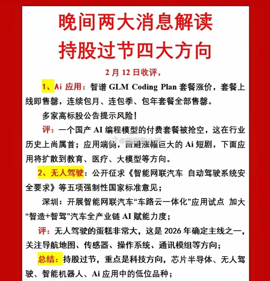 晚间两大消息解读,持股过节四大方向;2月12日收评,大家关注抖音号:海西一狼,50221786933;或者直接打开抖音查找用户:海西一狼;1、Ai应用:智谱GLM Coding Plan套餐涨价,套餐上线即售罄,连续包月、连包季、包年套餐全部售罄。多家高标股公告提示风险!评:一个国产AI编程模型的付费套餐被抢空,这在行业历史上尚属首;应用端侧,回避涨幅巨大的Ai短剧,下面应用将扩散到教育、医疗、大模型等方向。2、无人驾驶:公开征求《智能网联汽车 自动驾驶系统安全要求》等五项强制性国家标准意见;深圳:开展智能网联汽车“车路云一体化”应用试点 加大“智造+智驾”汽车全产业链AI赋能力度;评:无人驾驶的蛋糕非常大,这是2026年确定主线之一,关注导航地图、传感器、操作系统、通讯模组等方向;总结:持股过节,重点是科技方向,芯片半导体、无人驾驶、智能机器人、Ai应用中的低位品种;海西一狼:交易日中午12点直播