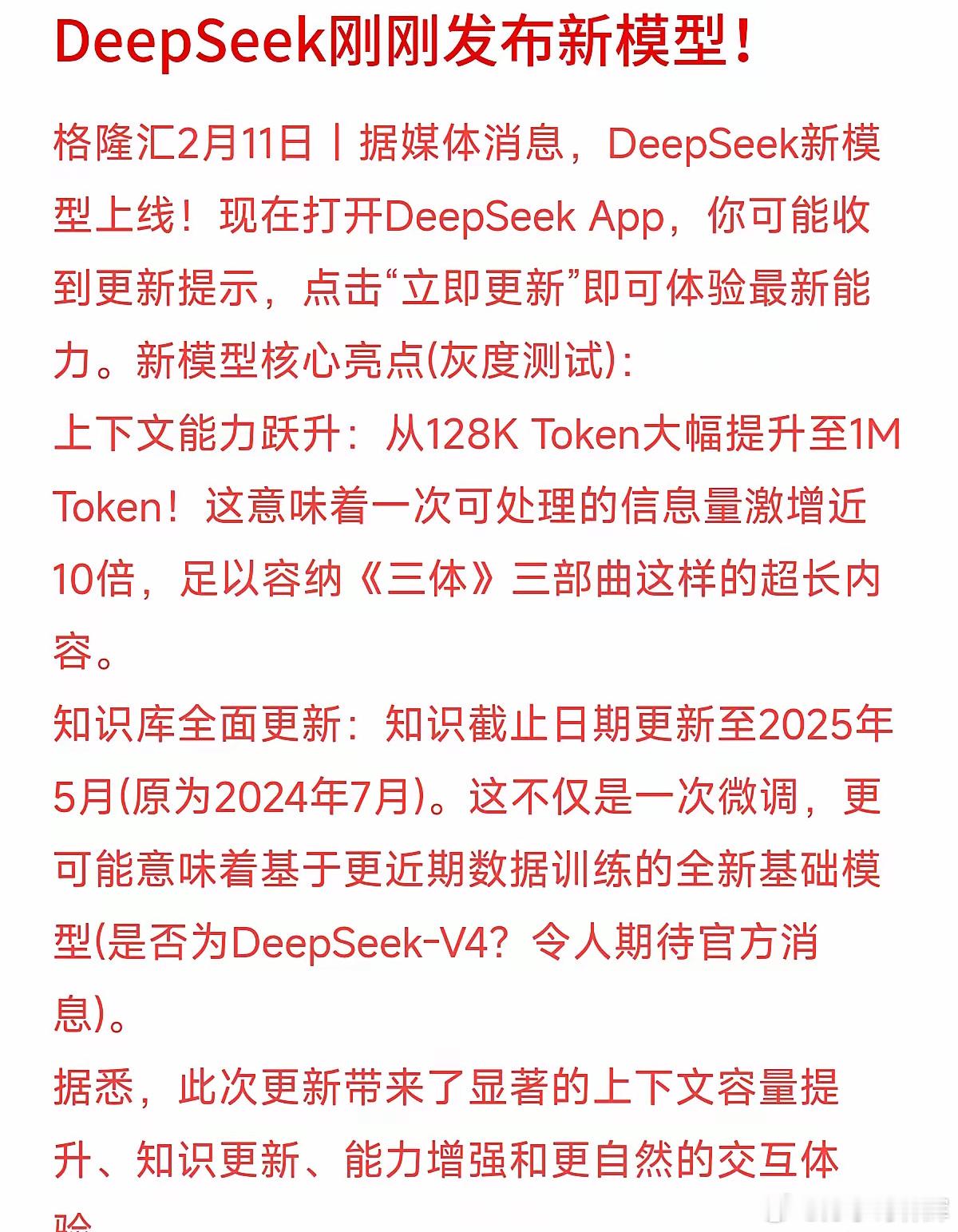 国产AI的“记忆力”封神了! 据媒体最新消息,DeepSeek新模型刚刚开启灰度测试,能力直接翻了近10倍! 核心看点就一个:上下文从128K暴涨至1M(100万)Token!