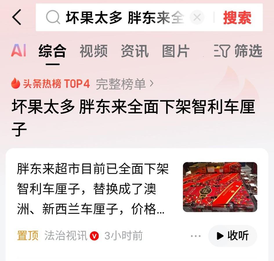 胖东来做事很果断! 2月12日,消费者反馈智利车厘子坏果多,它直接全线下架,换成澳洲和新西兰车厘子! 车厘子本来就挺容易坏的,夏季买我们国产的大连樱桃,放冰箱一两天就会坏! 这些进口的漂洋过海,路途就花了不少时间!再加上中间商囤货、保鲜期一过、气温回升等因素,坏果肯定会多! 长沙超市三十多块钱一斤! 个人认为,不觉得车厘子与其它水果更好吃! 水果是日常消耗品,平时每天会吃两三种水果,基本都是买几块钱一斤的,几十,几百块一斤,觉得太贵了! 坏果太多 胖东来全面下架智利车厘子