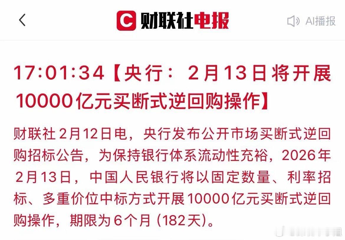 利好来了!央妈将开展10000亿买断式逆回购!A股最后一个交易日稳了?刚刚,央行放出重磅信号:明日(2月13日)将开展10000亿元为期6个月的买断式逆回购。这不仅是春节前最大规模的流动性“补水”,更是给A股市场注入了一剂强心针。·1万亿的规模,直接锁定了中期流动性,彻底打消了市场对春节前资金面紧张的担忧。·万亿资金注入,市场利率下行,两融成本降低,增量资金入市的动力更足。·充裕的流动性会提升股票资产的吸引力,尤其是对高成长、高弹性板块(如银行、券商、科技等板块)。·这是央妈在节前关键节点的强力托底,传递出“稳预期、稳市场”的强烈信号。客观说,1万亿推不起全面牛市,但它划了一条明确的线:流动性托底已就位!明天是春节前最后一个交易日,往年此时“持币还是持股”的纠结,今年有了更清晰的答案。央妈用真金白银给市场注入信心,短期内对资金面和情绪的提振作用毋庸置疑。