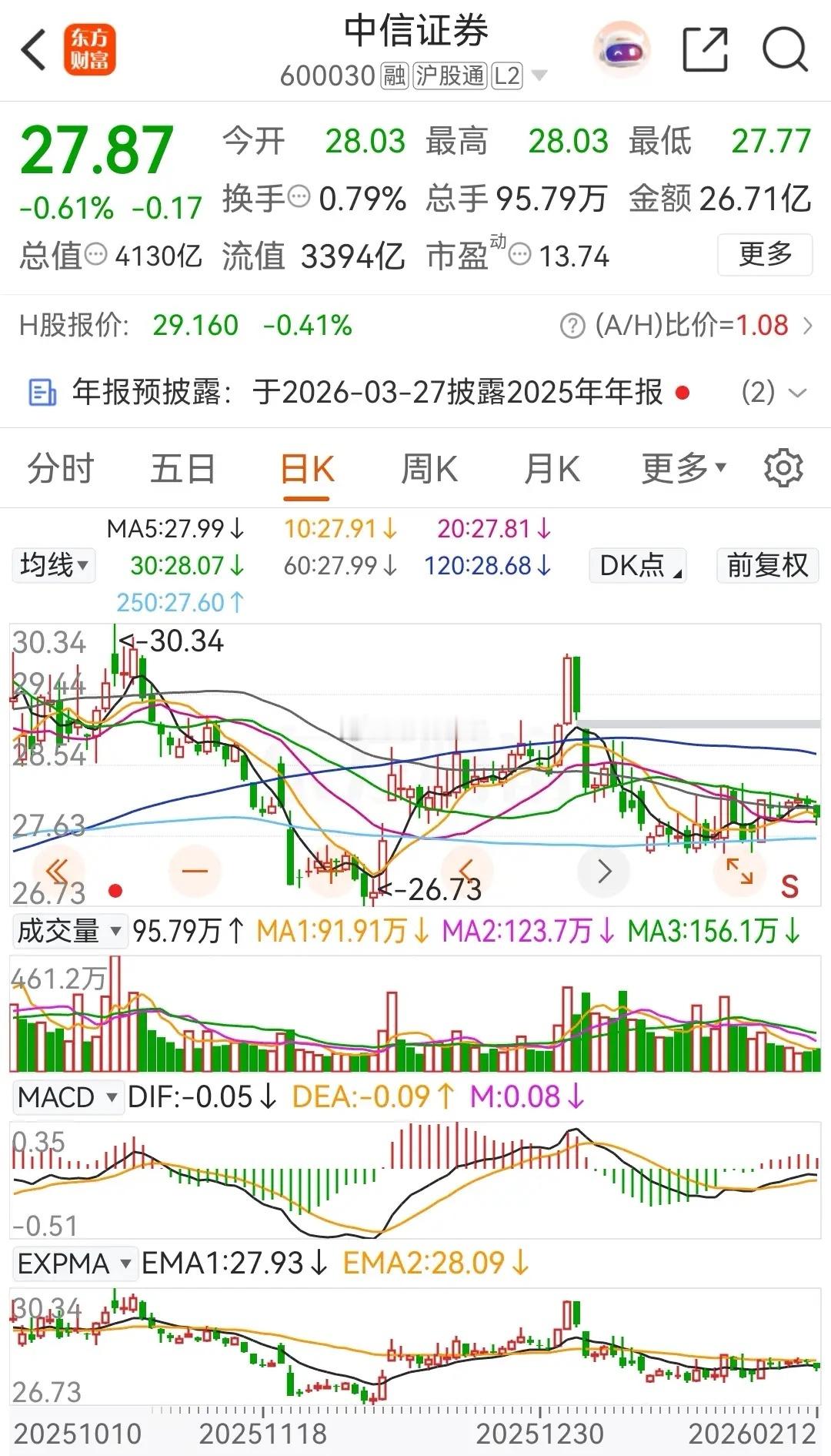 券茅东方财富连续三天下跌,连续三天被主力资金净卖出;券商一哥中信证券则是连续两天下跌,连续三天被主力资金净卖出;截止今日收盘,东财在2026年的涨幅为-2.24%,而中信证券在2026年的涨幅为-1.94%。下面来看看今天的走势情况。