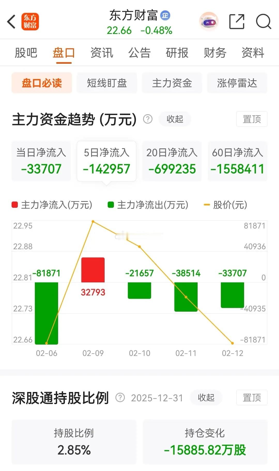 东方财富今天低开小V后走低 ,最终收出了一根缩量小阴线,目前已是连跌三天了。今天跌幅为0.48%,报价为22.66元。在资金流向上,今天备被主力资金净卖出了3.3707亿元,目前已是连续三天净卖出了,而近五个交易日则是被主力资金合计净卖出了 14.2957 亿元。从走势上看,连续三天缩量下跌,整体上还是处于破位之中,但是今天的震荡幅度非常窄小,可以说是到极致了,今天的最高价22.77元,最低价22.65元,收盘价22.66元,这是在酝酿着变量。