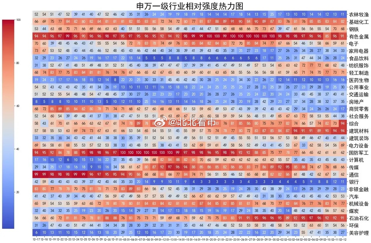 建筑材料(94)、综合(94)、有色金属(91)、石油石化(91)等四个行业,最新的强度都超过了90。