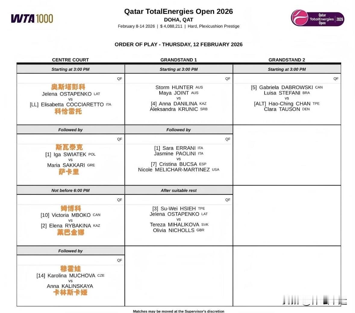 2026年WTA多哈站女单比赛真是冷门不断!头号种子斯瓦泰克6-2、4-6、5-7爆冷不敌萨卡里,无缘半决赛,这一结果让不少人惊掉下巴。 这赛事被称为“种子坟场”,所言非虚。4号种子高芙被排名57位的资格赛幸运儿科恰雷托打得没脾气,连续三年一轮游;3号种子阿尼西莫娃决胜盘退赛;6号种子保利尼0 - 2脆败;8号种子亚历山德罗娃也0 - 2出局。还有11号、13号、15号、16号种子,统统一轮游。不过郑钦文表现不错,虽复出首秀惜败莱巴金娜,但之前比赛也展现了实力。女网赛场真是充满不确定性,永远不知道下一个冷门会是谁。