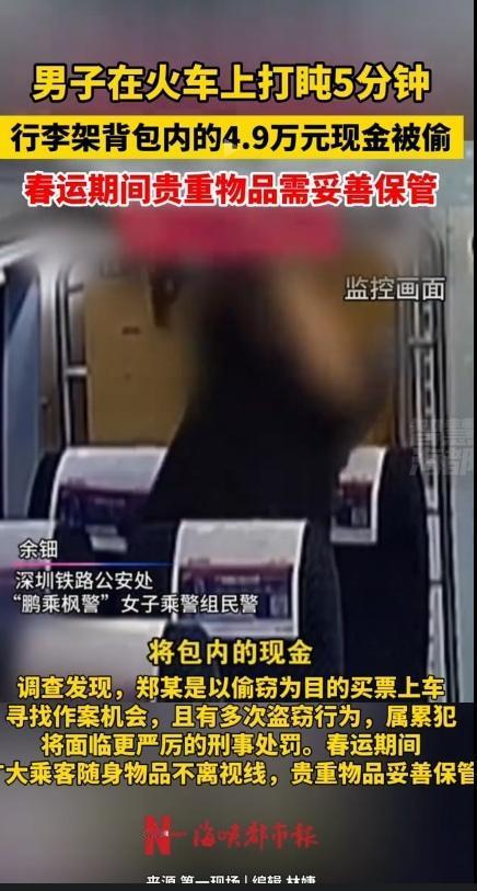 可得长长记性!最近刷到个新闻,看得我后脊梁骨直冒凉气:在C7038次列车上,深圳开往广州白云站的那趟,有个王先生,就打了个盹,5分钟的功夫,行李架上背包里的4.9万现金,被人给顺走了。 4.9万啊,这可不是小数目。我估摸着,这钱要么是他攒了一年的血汗钱,一家人打算用这笔钱过个好年。 监控画面看得人揪心:一个叫郑某的惯犯,就趁着王先生打盹的间隙,像个幽灵一样在过道里来回晃悠,眼神直勾勾地盯着行李架。他先是“再看一眼,再看一眼”,确认没人注意,然后就动手挪动背包,悄悄取下来,把里面的现金快速转移到自己的挎包里,整个过程行云流水,一看就是老手。 王先生醒过来发现钱没了,那得有多慌啊!换谁谁不崩溃?好在最后深圳铁路公安给力,在广州的一个出租屋里把郑某给抓了,追回了4.86万元。但想想都后怕,要是郑某跑得再快一点,或者藏得再深一点,这钱可能就真的找不回来了。 我看完这个新闻,心里五味杂陈。一方面是气,气郑某这种人,专挑春运人多眼杂的时候下手,专挑别人辛辛苦苦攒的钱偷,简直是坏到骨子里了。调查还说他是为了偷窃专门买票上车,而且有多次盗窃前科,是个惯犯,这种人就应该从重处罚,让他在牢里好好反省。 另一方面,也是替王先生捏一把汗,同时也想提醒大家一句:春运路上,真的不能有一丝一毫的侥幸心理。 你想想,我们辛辛苦苦在外打拼一年,就盼着过年回家,和家人团聚。这4.9万,可能是他起早贪黑、风吹日晒攒下来的,每一张钞票上都浸透着汗水。就因为打了个盹,差点让一年的辛苦付诸东流。 很多人可能会说:“不就是打个盹吗?至于吗?”可现实就是这么残酷。在拥挤的火车上,在疲惫的旅途中,你的一个疏忽,就可能给坏人留下可乘之机。行李架上的背包,看似安全,其实在坏人眼里,那就是明晃晃的目标。 所以啊,春运路上,贵重物品真的不能离身,更不能离视线。现金、手机、身份证、银行卡,这些东西最好贴身放,或者放在自己能随时摸到的包里。哪怕再困,也别睡得太死,稍微留个心眼,比什么都强。 为什么春运期间,这种盗窃案总是屡禁不止? 一方面,是坏人太狡猾。他们知道春运人多,大家归心似箭,警惕性会降低,所以专门挑这个时候出来作案。而且像郑某这样的惯犯,经验丰富,下手快准狠,让人防不胜防。 另一方面,也和我们自己的麻痹大意有关。我们总觉得“不会这么倒霉吧”“我就离开一会儿没事的”,可偏偏就是这种侥幸心理,让坏人有机可乘。 春运,对我们来说是团圆,是温暖;可对某些人来说,却是“发财”的机会。我们在憧憬着家里的热饭热菜,他们却在盘算着怎么偷走我们的希望。 所以,在这里也想跟大家说一句:春运路上,保护好自己的财物,就是保护好自己和家人的幸福。别让一年的辛苦,毁在一念之间的疏忽里。