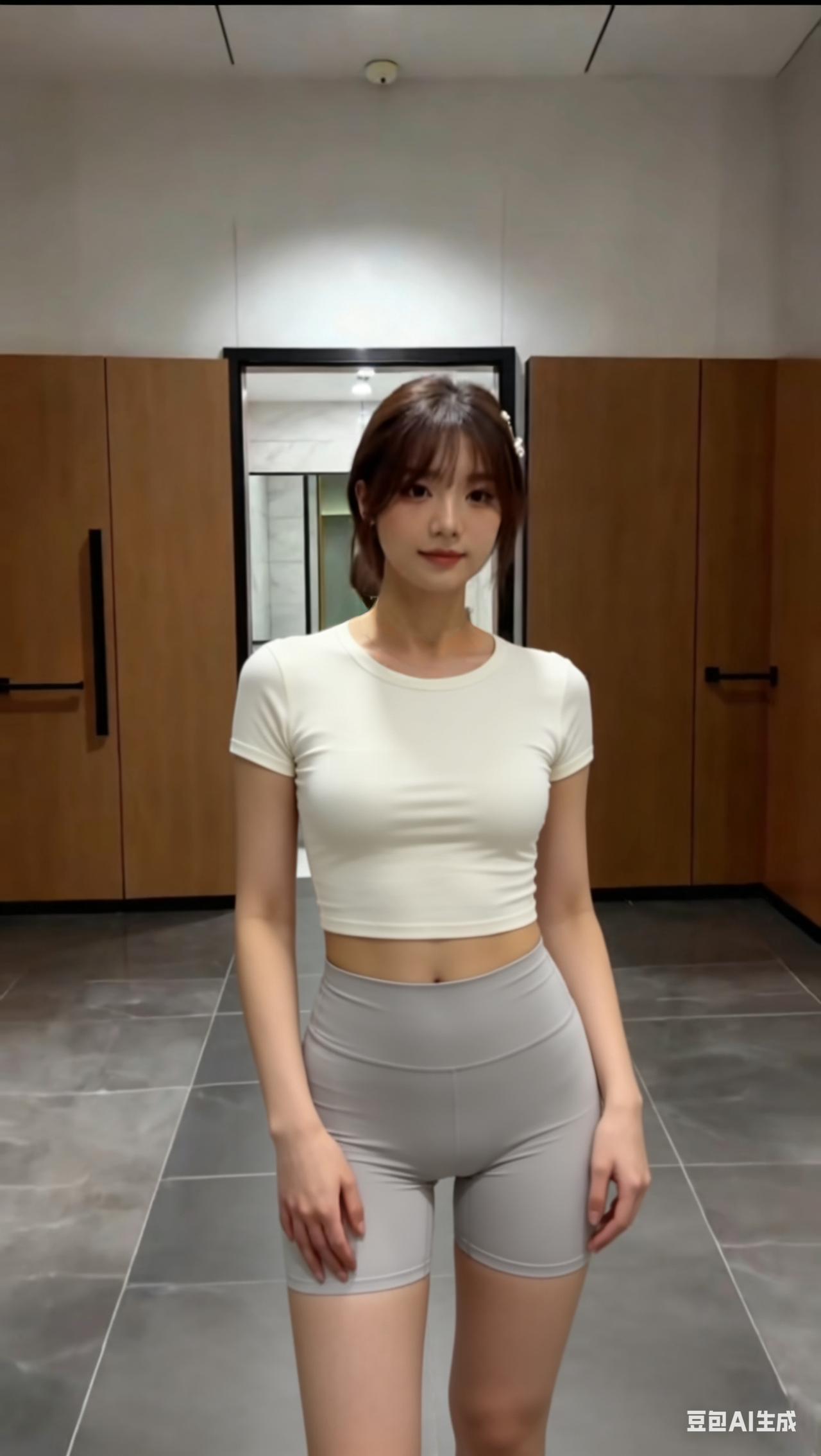 米白色短款紧身T恤, 整体穿搭简约又充满运动感, 完美展现出健身女孩的活力与自信。