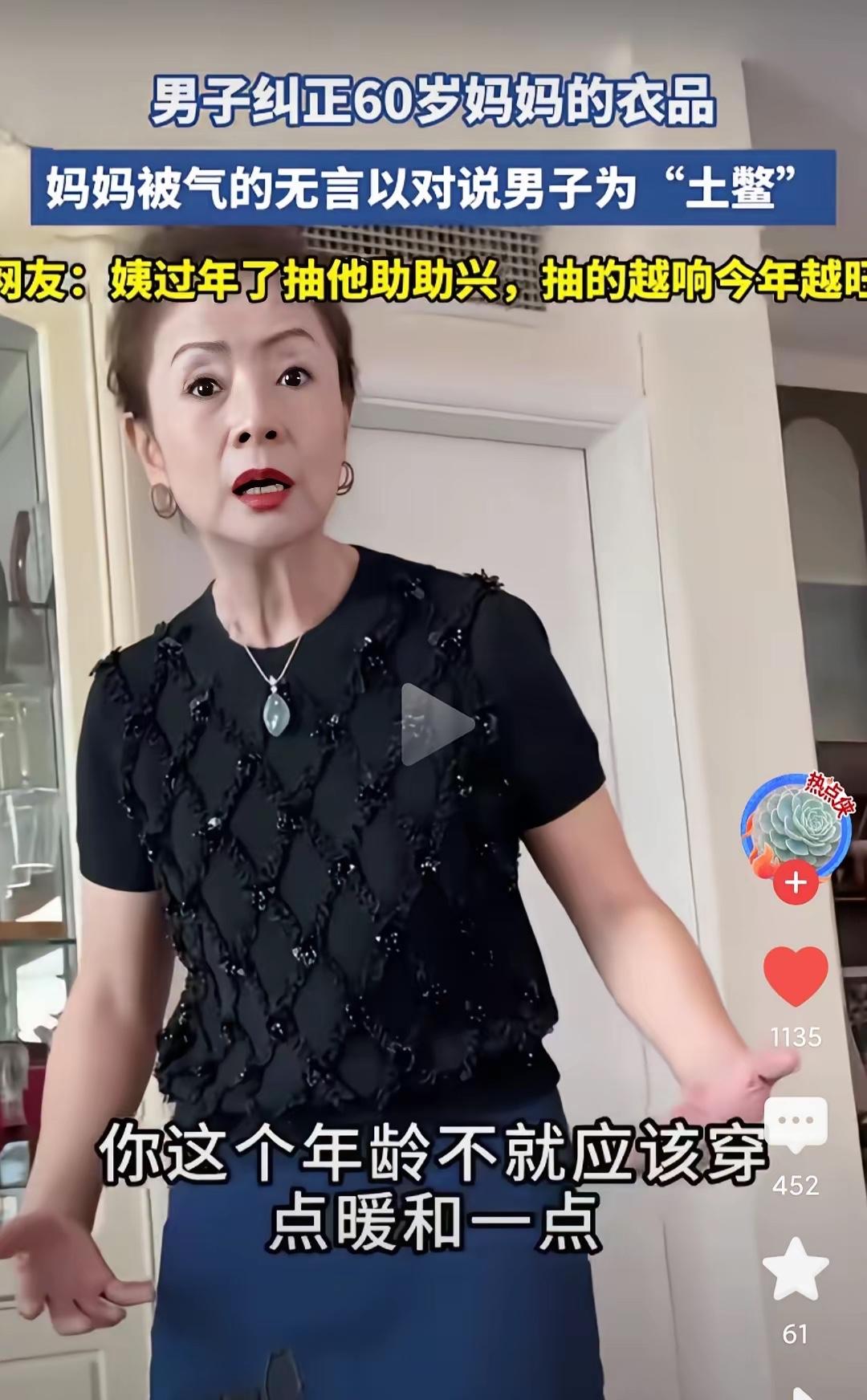 60岁妈妈的精心打扮,没想到迎来了儿子的吐槽:你这个年纪不该穿的暖和点吗?你这个腿露着,碰到我同学我该怎么说? 气的妈妈指着儿子感叹:我怎么生了你这样一个土老冒?! 看着视频,把我笑死了。当时髦妈妈遇上钢铁儿子,结局只有好笑又好气! 其实儿子的担忧不无道理:这个裙子过年穿,真的会冷。 这位60岁的妈妈可不是一时兴起赶时髦,她退休后就一直保持着精致的生活习惯,平时爱逛服装店、学搭配,把自己收拾得清爽体面,在她心里,年龄从来不是束缚爱美的枷锁。过年本就是值得打扮的日子,她挑了心仪的裙子,精心搭配好妆容,满心欢喜想漂漂亮亮过节,这份对生活的热忱,比任何穿搭都珍贵。 儿子的吐槽里藏着两层心思,一层是实打实的心疼,寒冬腊月露着腿,他怕妈妈冻着生病,这是藏在直白话里的孝心。另一层却是年轻人抹不开的面子,他担心同学看见妈妈的穿着,会生出闲言碎语,怕自己被议论,便把这份社交焦虑,直接甩给了用心打扮的妈妈。 他下意识给60岁的妈妈套上了刻板标签,在他的认知里,这个年纪的女性就该穿宽松的棉衣、厚实的棉裤,把自己裹得严严实实,爱美、时髦都是年轻人的专利,中老年就该守着“稳重保暖”的规矩。这种想法不是个例,是很多子女都有的思维误区,总用自己的标准定义父母的生活,却忘了父母首先是他们自己,其次才是长辈。 妈妈那句“土老冒”的吐槽,满是被否定的委屈和不服气。她辛苦打扮不是为了取悦谁,只是想为自己活一次,不用看子女的脸色,不用被年龄框住,穿自己喜欢的衣服,活成自己喜欢的样子。这份不将就的生活态度,反倒比固守成规的年轻人通透得多。 关心从来都不该变成管控,提醒妈妈添衣保暖是贴心,指责妈妈的穿搭、拿面子说事就是越界。父母操劳了大半辈子,好不容易有了属于自己的闲暇时光,追求美、追求精致,是他们应有的权利,子女能做的是尊重和支持,而非用偏见泼冷水。 现在越来越多的中老年长辈跳出年龄束缚,穿潮牌、化淡妆、走秀拍照,活成了让人羡慕的模样。他们的精致不是装腔作势,是对生活的热爱,是不被岁月打败的底气。比起裹着厚棉袄的将就,这份敢穿敢美的勇气,才更值得我们点赞。 好笑的是母子间的审美碰撞,好气的是子女对长辈的刻板偏见,而最该读懂的,是父母藏在穿搭里的,对生活永不褪色的热爱。 各位读者你们怎么看?欢迎在评论区讨论。