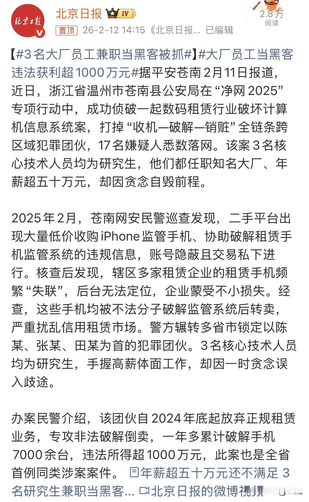 你敢信?年薪五十多万的大厂程序员,下班后偷偷干的事,比他们白天写的代码来钱快多了。 上海杭州,两个研究生,一个姓张一个姓田。 一个在知名大厂写程序,一个在另一家巨头敲代码。 朝九晚五,周末双休,五险一金拉满,年终奖够普通人干两年。 但他们还是觉得不够。 把他们拽进去的人叫陈某,高中同学。 陈某大学时候就开始倒腾手机租赁,正经生意干了好几年。 结果呢?租出去的手机,十台有三台收不回来。人跑了,手机也失联了,后台定位全黑。 后台明明绑着监管锁,就是找不到。干吃哑巴亏。 他琢磨来琢磨去,想通了:与其被人撸机,不如我去撸别人。 但技术他不会。 他想起两个高中同学,一个在上海,一个在杭州。 都是研究生,都在大厂,都懂代码。 陈某开口就说,你们下班帮我写点东西,一台提成你们几百块。攒个一两年,上海杭州的房子首付就有了。 两个人没拒绝。 这事真正有意思的地方,还不是这俩人。 是第三个人,姓孙。 孙某从头到尾没进过这个团伙,也不跟陈某打交道。但市面上流通的破解程序,源头全指向他。 他写代码,卖程序,有个下家帮他出货。 这个下家姓让,刚好在陈某公司上班。 陈某早听说过孙某这号人,托让某牵线,想直接跟孙某买源码。孙某根本不搭理他。 怎么办呢? 陈某干了件事。 他让公司其他员工,趁让某不注意,从他电脑里把孙某的程序源代码整个拷走了。 拿到手,交给上海杭州那两个同学。 二次开发,改头换面,打上自己的印记。 那个姓孙的技术大牛,从头到尾没跟陈某说过一句话。但他的代码,还是被陈某用上了。 这个团伙后来搞成小公司的样子。 有人专门从市面上低价收那些被“撸”下来的监管机。 有人专门负责破解,一台机器刷一遍程序,监管锁就废了。 有人专门出货,流到二手市场当正常机卖。 2024年底开始,陈某干脆把自己正规租赁那摊业务停了,全员只干这一件事。 一年多,七千多台手机从他们手里过了一遍。 一千多万进账。 苍南警方最早发现这事,源头在闲鱼。 有人在平台上发帖,说可以帮忙解除iPhone监管锁,价格私聊,不走平台交易。 网安民警顺着摸过去,发现好几家租赁公司后台,一批批手机定位全黑。 这些手机早就被拆了监管锁,改了串码,流到全国各地买家手里。 买家不知道这是租赁机,卖家不说。 租机公司设备没了,租客也跑了,坏账全背在自己身上。 专案组跑了安徽、北京、上海、杭州。 去年三月先在安徽收了十五个人。 去年五月,北京、上海、杭州同步动手。 三个大厂技术骨干,晚上刚下班,在家门口被带走。 手机清得干干净净。 聊天记录删完,转账记录抹掉,电脑格式化。 以为不说话就扛过去了。 警方把资金流水一条条捋,把破解记录一份份复原,把销赃渠道一个个摸透。 证据链全部扣死。 零口供,直接刑拘。 那个从头到尾没露过面的孙某,也一并落网。 十七个人,全部移送检察机关。 回头看这事,最让人说不上来的是陈某那条线。 他本来是吃亏的人。 租出去的机器被人撸走,后台定位失灵,客户翻脸不认账。 吃多了亏,他没想着报案,也没想着加固系统。 他想的是,干脆我也干这行。 从一个受害者,硬生生把自己变成了加害者。 两个大厂程序员,白天写企业级应用,晚上写破解程序。 不是不会算账。 七千多台手机,摊到一年多时间,平均每天不到二十台。 一台抽成几百块,分到三个人头上,其实没那么吓人。 但他们还是干了。 那个姓孙的技术大牛更奇怪。 他不缺买家,也不缺渠道。程序写好往外一挂,自然有人找上门。 但他偏偏不跟陈某打交道。陈某托人找他买源码,他不卖。 结果呢。 源码还是被拷走了。 他不想赚这笔钱,钱还是没绕过他。 案子现在移交检察院了。 十七个人,从老板到技术员到出货的小工,一个没跑掉。 那些被解锁的七千多台手机,有的在二手市场流通,有的已经被刷了好几手,有的买家到现在也不知道自己花几千块买回来的机器,随时可能被远程锁定。 租赁公司那边,设备是追不回来了,坏账也抹不平。 一条黑产链条,养活了十七个人一年多。 到最后,收网的还是苍南那班民警。 这个案子你们看完什么感觉。