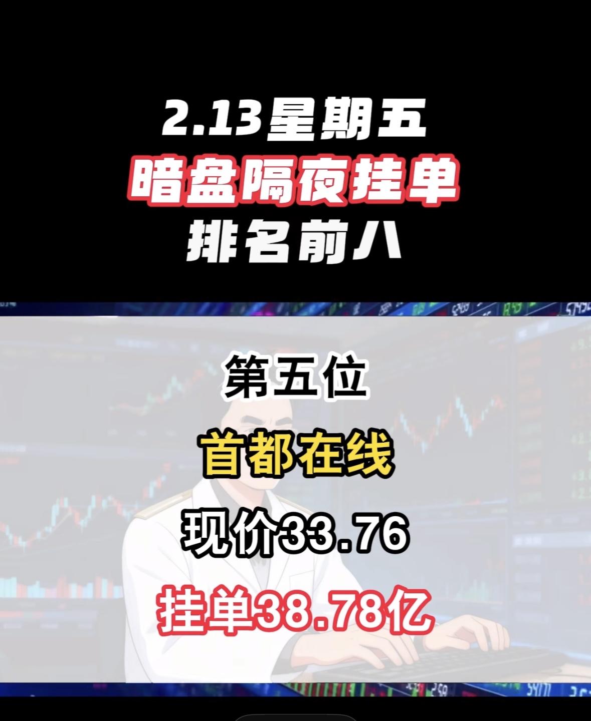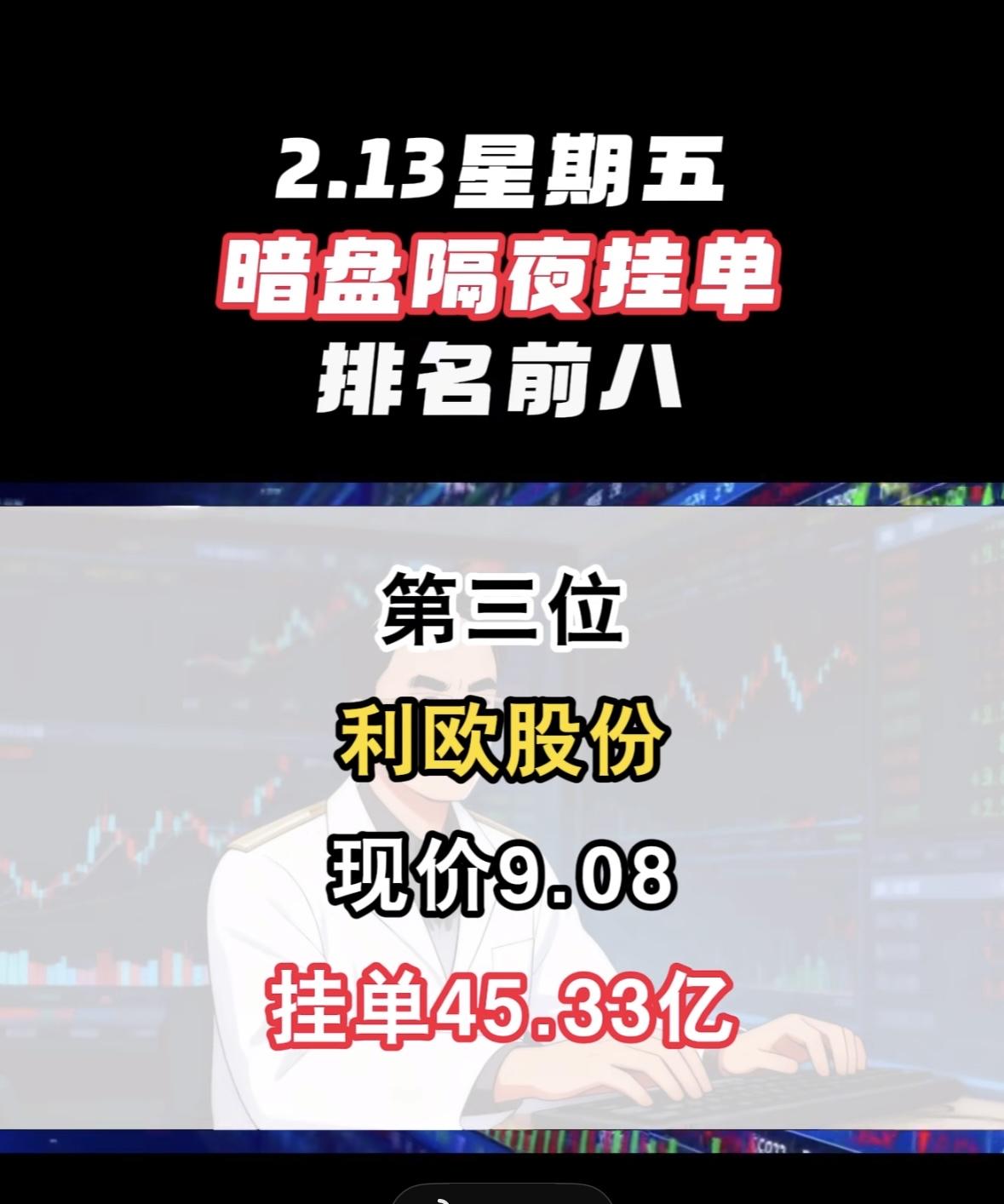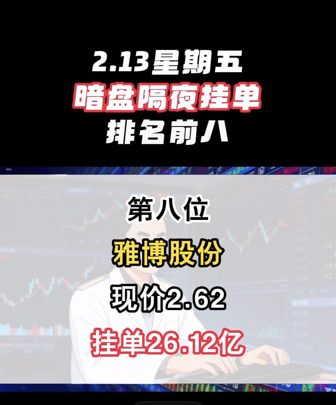 2.13暗盘隔夜挂单榜前八:雅博股份现价2.62,挂单26.12亿! 掌阅科技暗盘挂单火爆,资金抢筹热情高涨,现价飙升引市场瞩目,投资者排队入场争抢头筹。