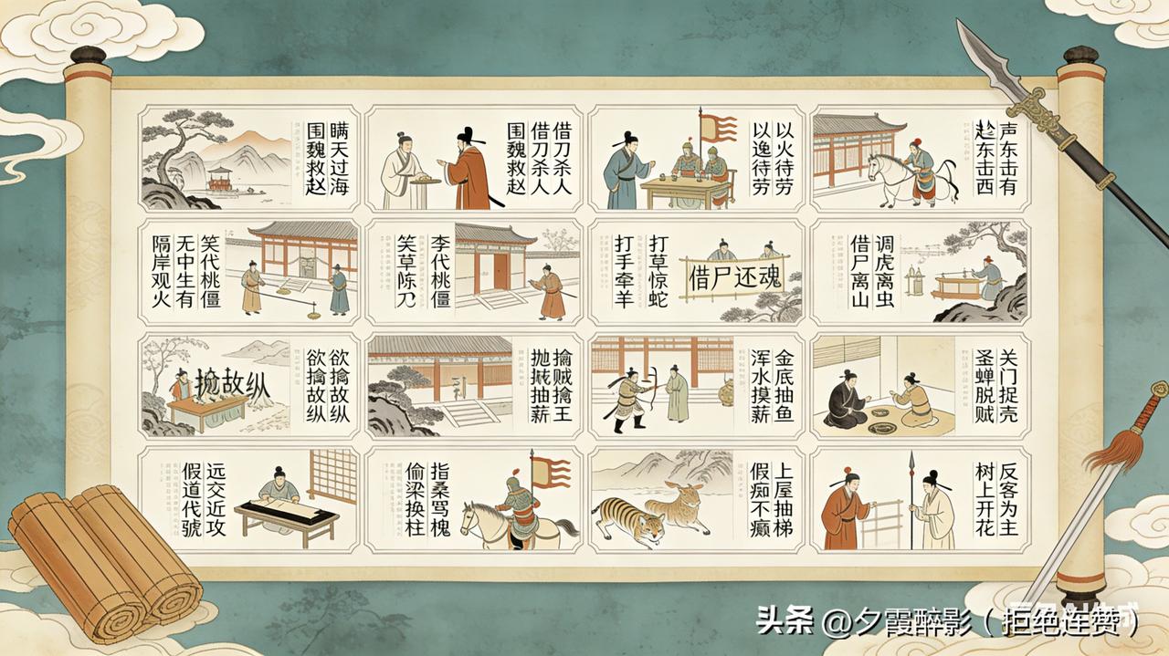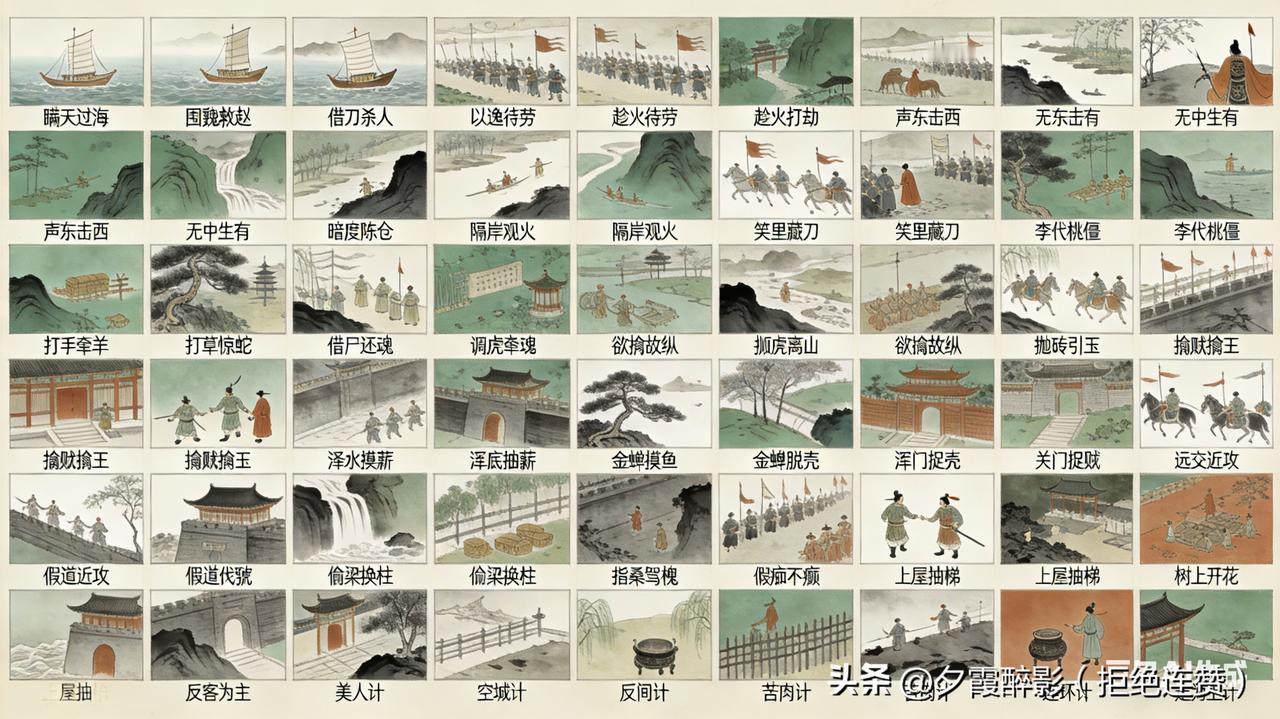 胜战计:瞒天过海、围魏救赵、借刀杀人、以逸待劳、趁火打劫、声东击西 敌战计:无中生有、暗度陈仓、隔岸观火、笑里藏刀、李代桃僵、顺手牵羊 攻战计:打草惊蛇、借尸还魂、调虎离山、欲擒故纵、抛砖引玉、擒贼擒王 混战计:釜底抽薪、浑水摸鱼、金蝉脱壳、关门捉贼、远交近攻、假道伐虢 并战计:偷梁换柱、指桑骂槐、假痴不癫、上屋抽梯、树上开花、反客为主 败战计:美人计、空城计、反间计、苦肉计、连环计、走为上计
