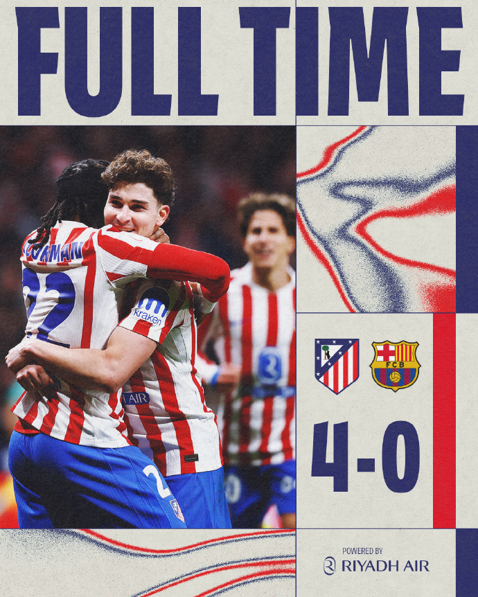 上半场霍安超巨失误送礼,埃里克乌龙,格列兹曼弑旧主,阿尔瓦雷斯和卢克曼互献传射;下半场库巴西进球被VAR判罚越位无效,埃里克直红。最终马竞首回合4-0大胜十人巴萨,马竞占得晋级决赛先机,巴萨各赛事6连胜终结,双方将于3月4日移师诺坎普球场进行次回合较量。