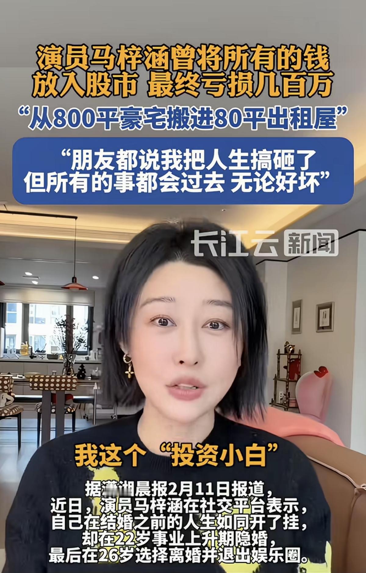 经历过人生的风浪和考验,眼前的逆境只是又一场戏,终将退场。这位曾经的女演员在股市亏了几百万,从800平的豪宅搬进了80平的出租房,但她仍然坦然、淡定。 她22岁就结婚了,不管怎么说都是有点早。 城市里的女生在30岁以后还单身的不在少数,22岁刚刚大学毕业的年纪,有几个会选择结婚呢? 在事业上升期不继续拼一拼而是选择结婚,即使是隐婚,也是挺有想法的。 如果不是遇到了真爱,那也是很传统,刚过了适婚年龄就选择了结婚。 26岁离婚并不稀奇,但为什么要退出娱乐圈呢? 现代生活节奏快,4年的婚姻不算很短暂,尤其是在娱乐圈。 不知道是不是因为在这场婚姻中经受了打击,为什么她会选择退出娱乐圈呢? 在26岁这样的年纪,她比同龄女生经历得更多,结婚了,又离了; 事业蒸蒸日上,却又换了赛道重新开始。 她自称是投资的“新手小白”恐怕是在股市里赔了几百万之后得出的结论。 离婚了,也不接戏了,她要自己养活自己,但却选错了方向。 想在股市里赚钱,哪有那么容易? 这不是快速积累财富的捷径,但多数人经不住诱惑,只看到别人成功的故事,就难免会这么想。 她之前赚的钱相对来说并不难,也挺快,但去得也不慢。 她在股市里梭哈了所有的钱,赔了几百万,或许也不算多,同时也让她更加清醒了。 虽然从800平的豪宅搬进了80平的出租房,但看起来她还是能坦然面对,淡定接受这一切的。 朋友们说她把人生搞砸了? 这要看怎么算了。 她能得出这样的结论:所有的事都会过去,无论好坏,就算“搞砸了”也无妨,毕竟这个年纪一切都还来得及,包括婚姻和事业。 人生没有白走的路,每走一步都算数。 看得多了,尤其是经历多了,才会成熟,才懂敬畏。 人生的路,走过了黑暗,剩下的就只有光明了。