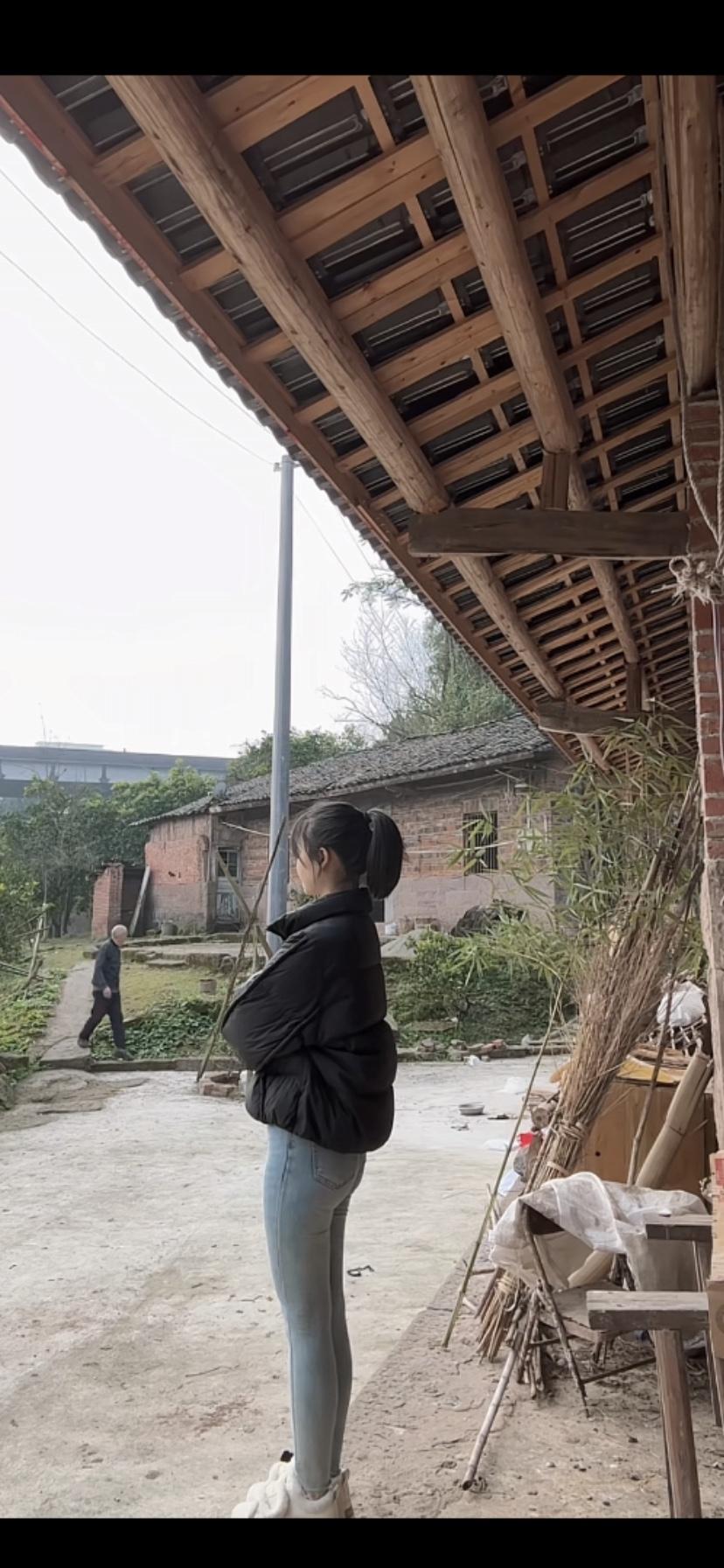 乡村的宁静时光,少女在老屋下沉思。