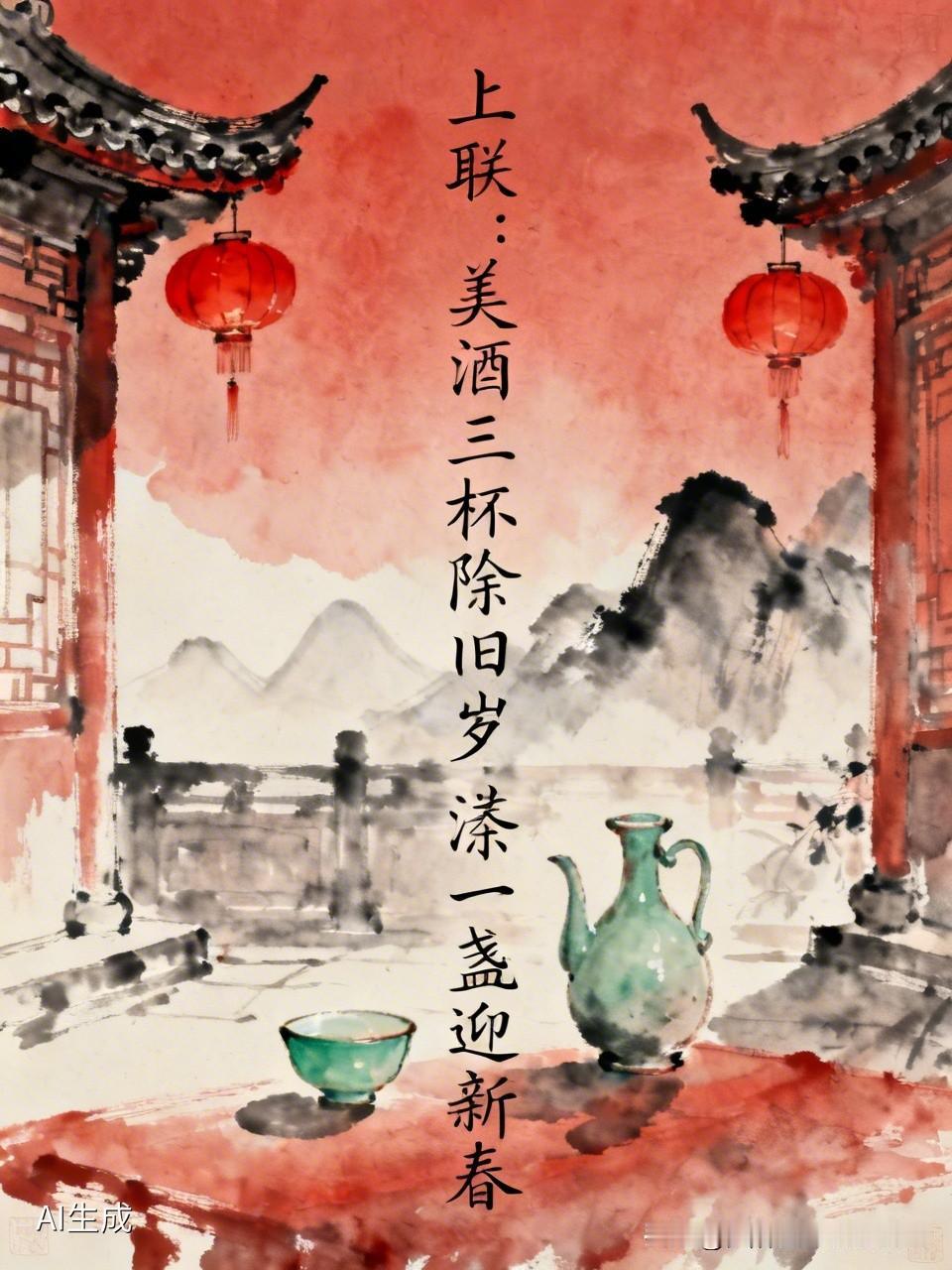 上联:美酒三杯除旧岁 下联:清茶一盏迎新春