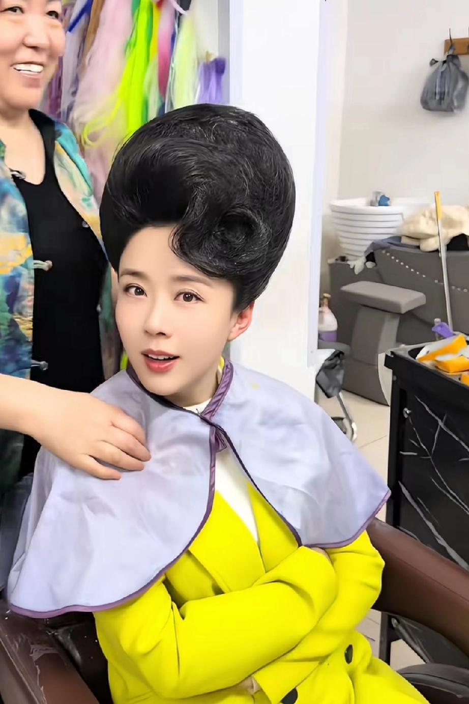 咋一看还以为是曾黎呢,仔细一看名字原来是颜丹晨。颜丹晨也是闲的没事弄着玩的,本来漂漂亮亮的大美女,盘上这个“巨无霸”后一下子变成了大妈气质。这多亏颜大美女的底板在线,盘上这么丑的发型也不影响她的颜值,还有脑袋后面的那个福字超级雷人。