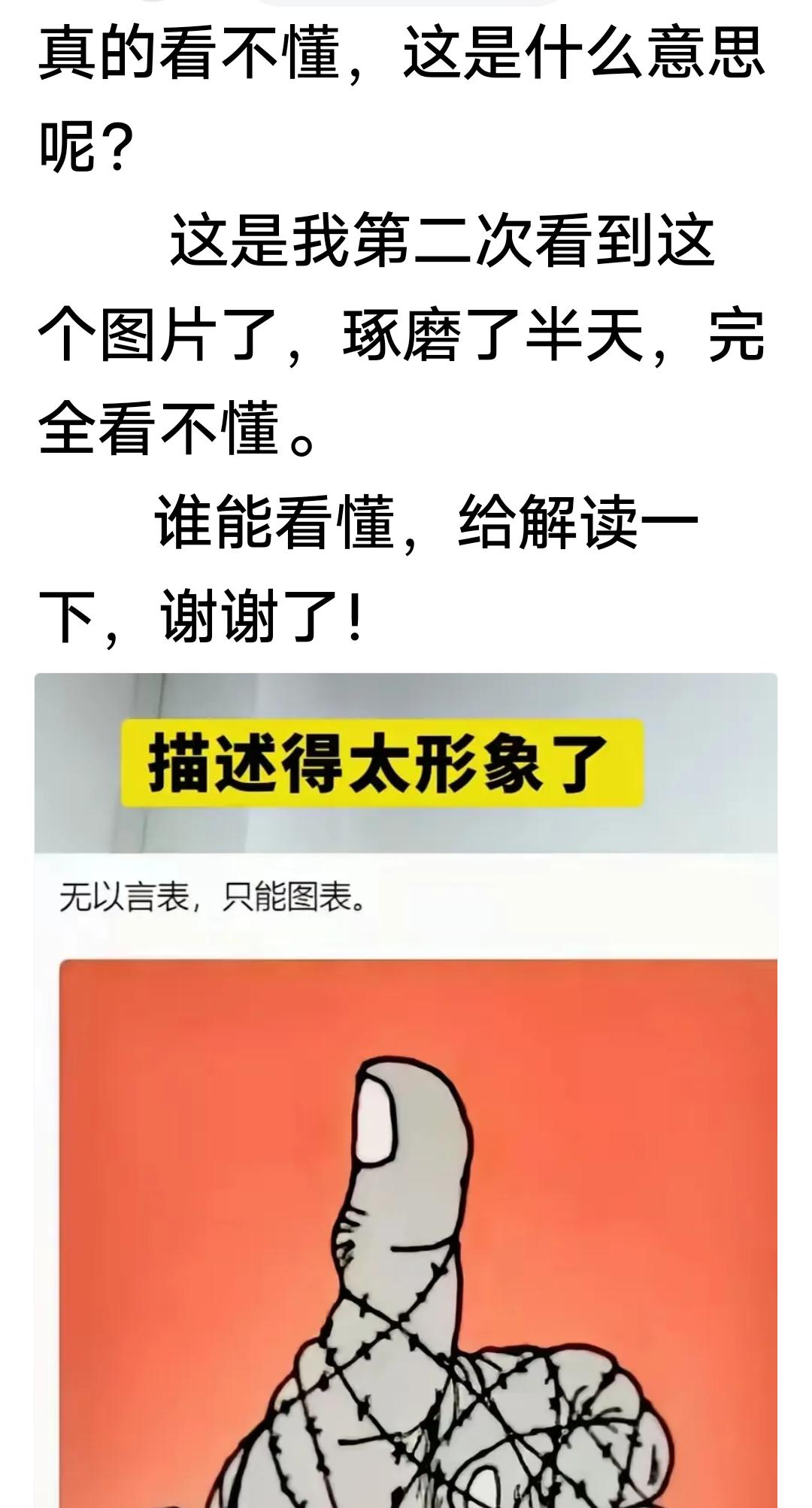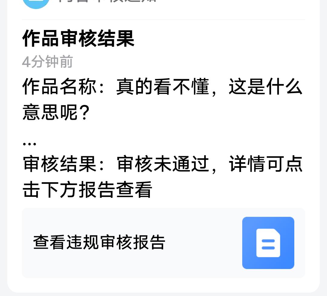 太无可奈何了!这头条越来越让人摸不着头脑了! 我发了一个微头条,就是下面这个,刚有点流量,达到五万多的展现量,正暗自高兴呢,因为最近流量一直不好,系统就不给推,可谁知还没高兴一会,突然收到系统通知,审核不过关! 发出去的时候审核通过了,可是流量一上来,就审核不通过了,这是闹的哪一出呢? 大家可以看看,我就发了个图片,问问大家这个是什么意思,因为我真的不懂,这就违规了吗?那这也太恐怖了吧! 随便和谐别人的作品,这也太任性了吧? 忽然想起来一句话,说你行你就行,不行也行,说你不行你就不行,行也不行。